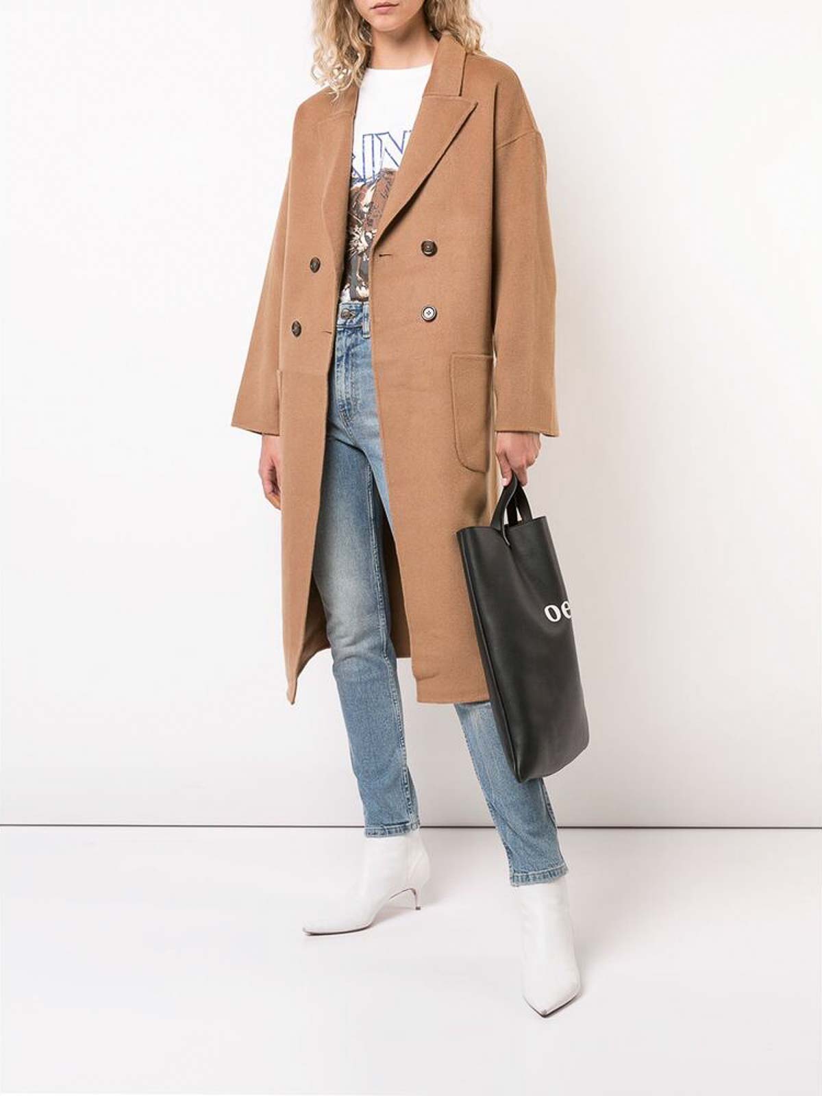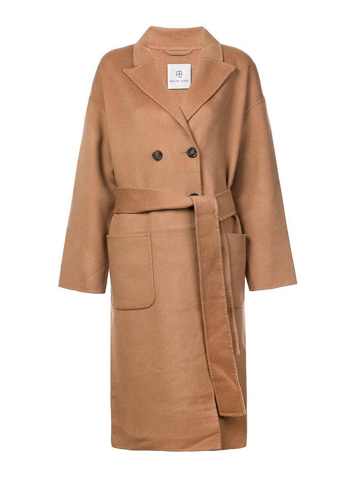 Camel brown, blend peak lapels shoulder long sleeves double, breasted button belt loops belted waist two patch pockets straight hem below, knee length