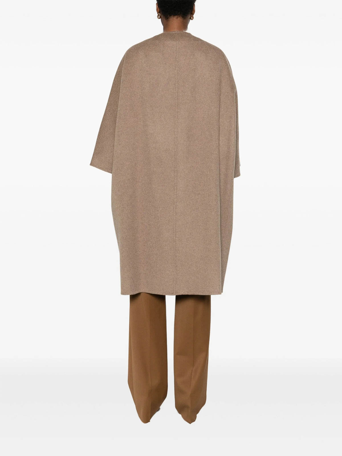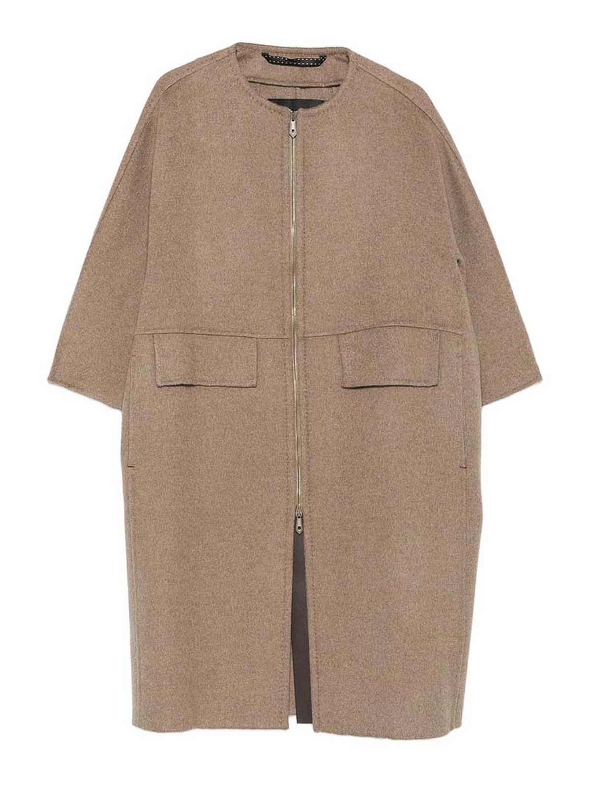 Light brown two, way zip flap pockets round neck three, quarter sleeves