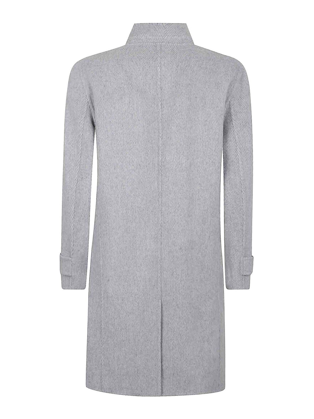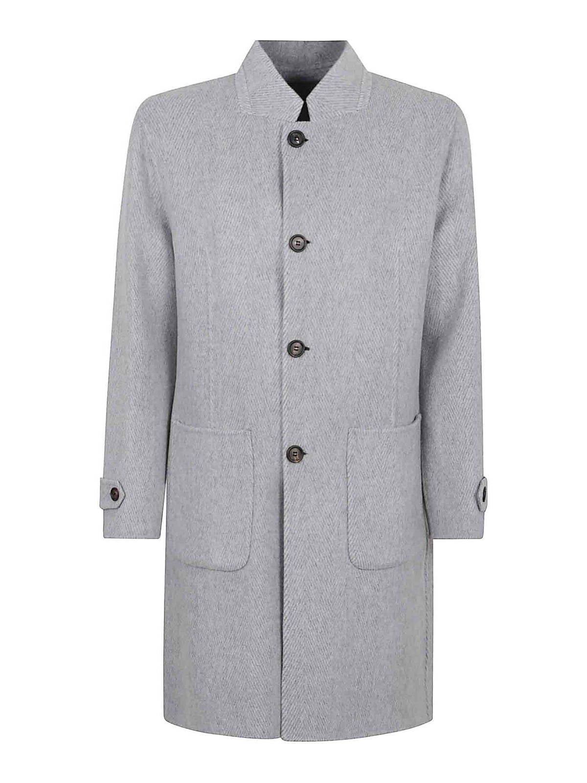 Light gray cashmere and wool jacket. Zigzag pattern. Button closure