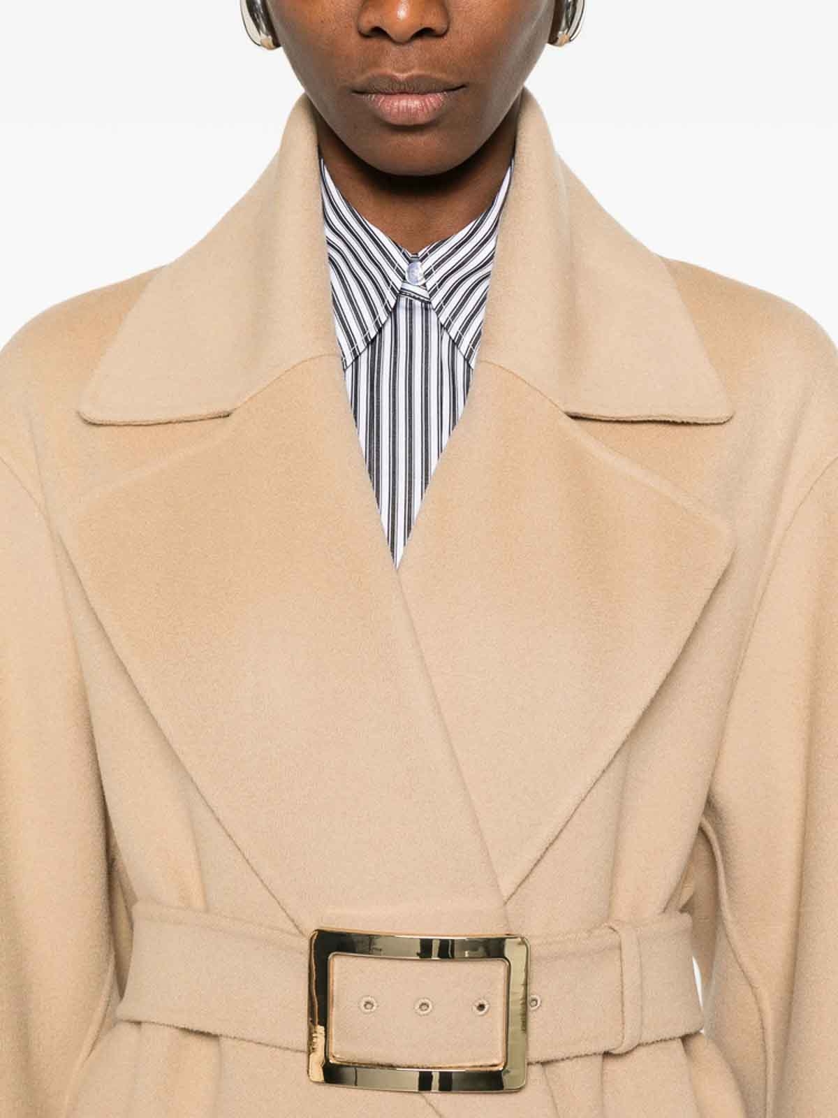 Light brown notched lapels belt buckle fastening patch pockets long sleeves