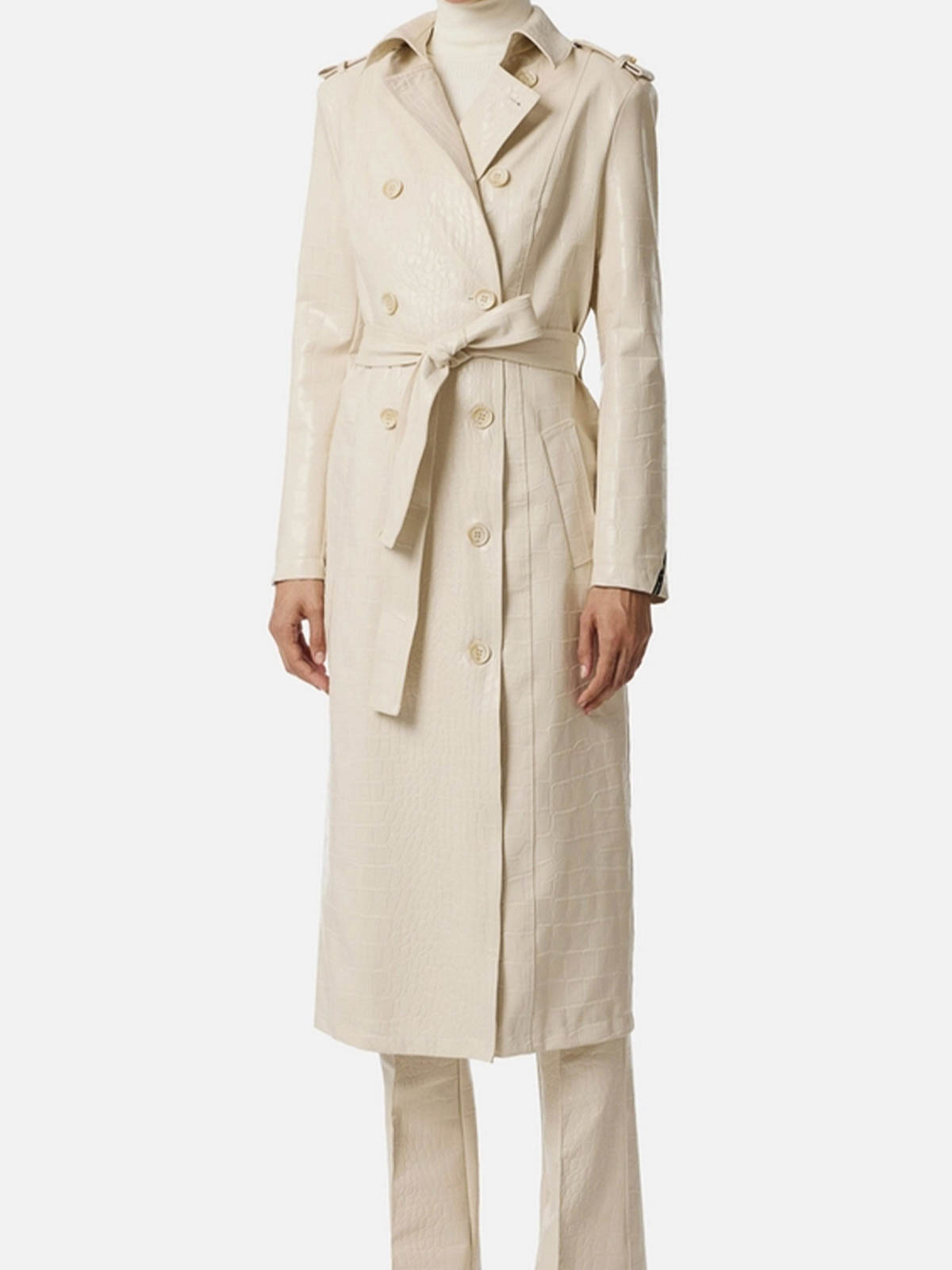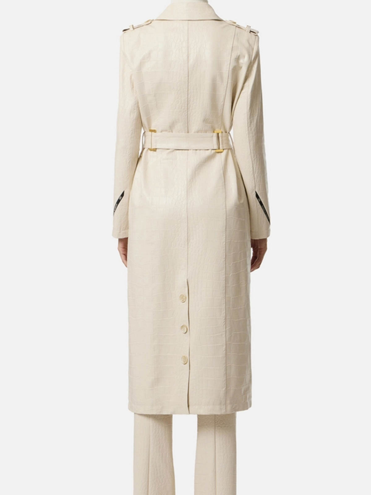 Elisabetta franchi trench coat made from synthetic leather-effect material with a crocodile print texture, structured shoulders with epaulettes, double-breasted fastening and belted waist, sleeves defined by diagonal ribbons with logo, back with button pl
