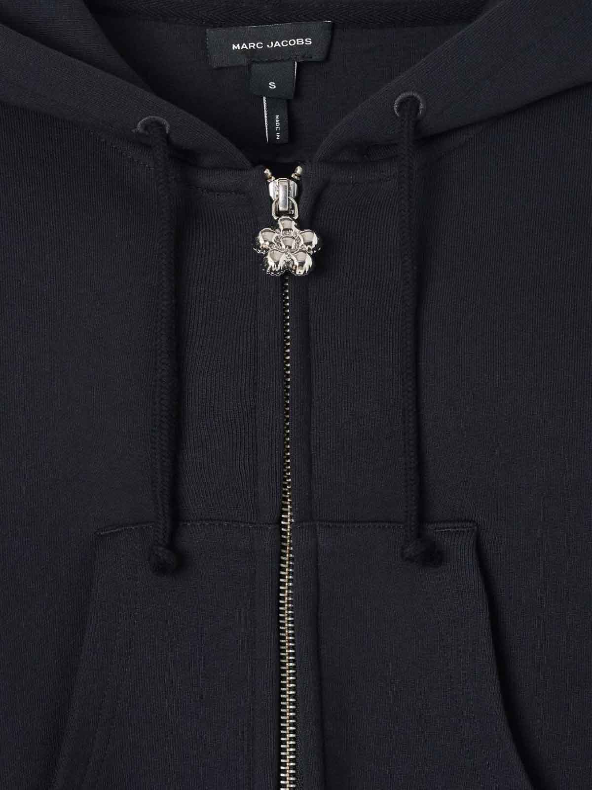 Black front zip fastening two front pouch pockets slouchy drawstring hood long sleeves