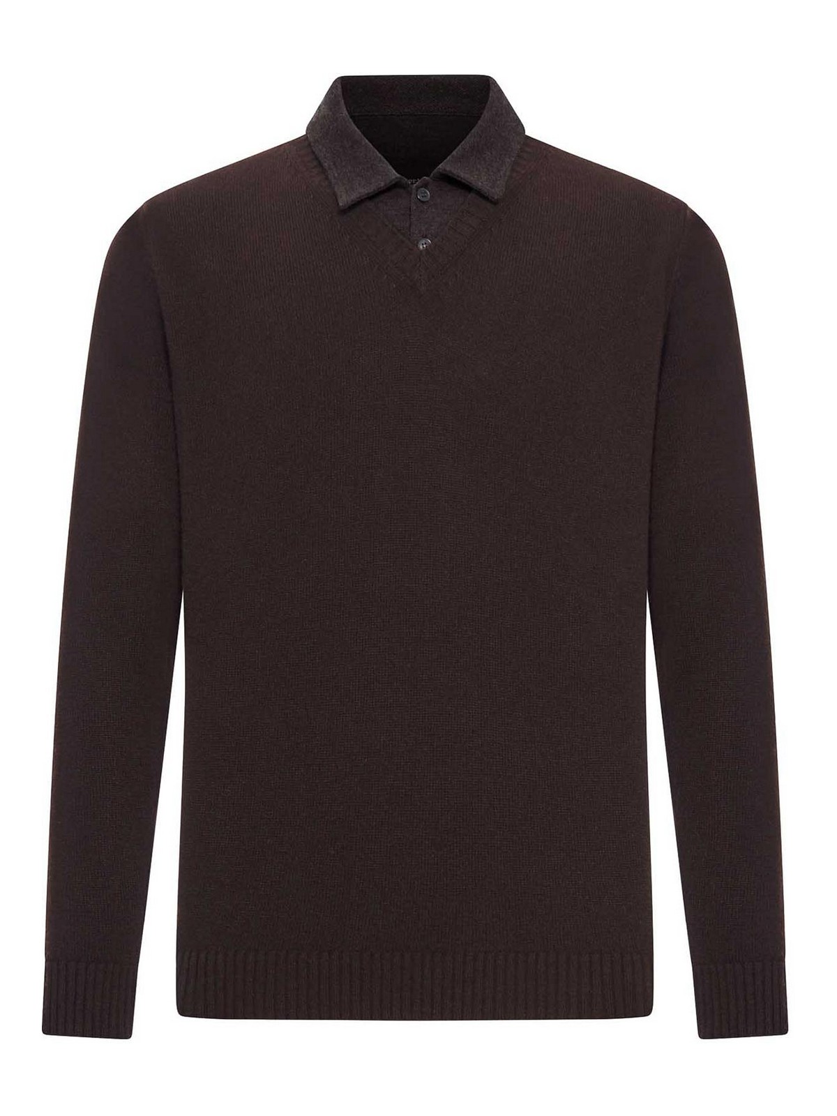 Classic buttoned collar, v, neck, long sleeves, straight hem, ribbed edges, -, brown