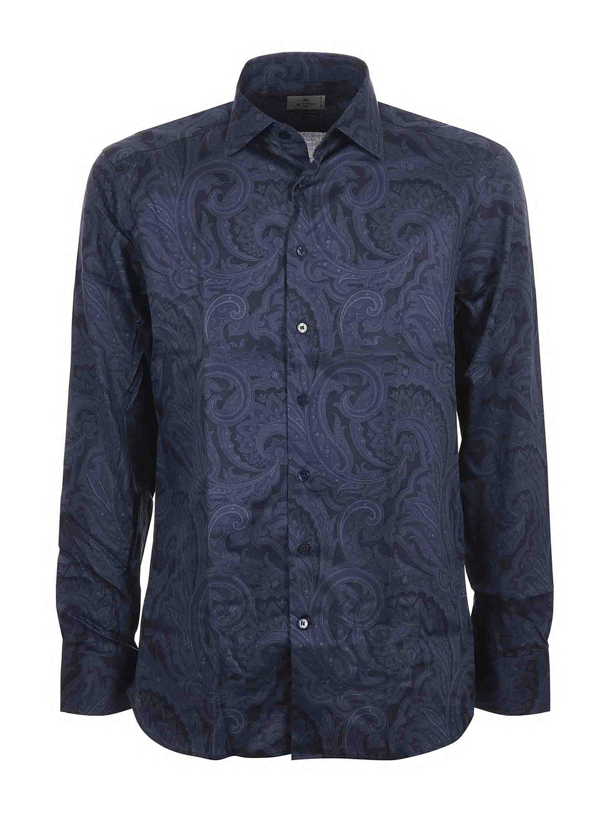 Etro cotton shirt in blue with a matching paisley pattern. italian collar. long sleeves. buttoned cuffs. button closure. regular fit. size shown: 39 100% cotton
