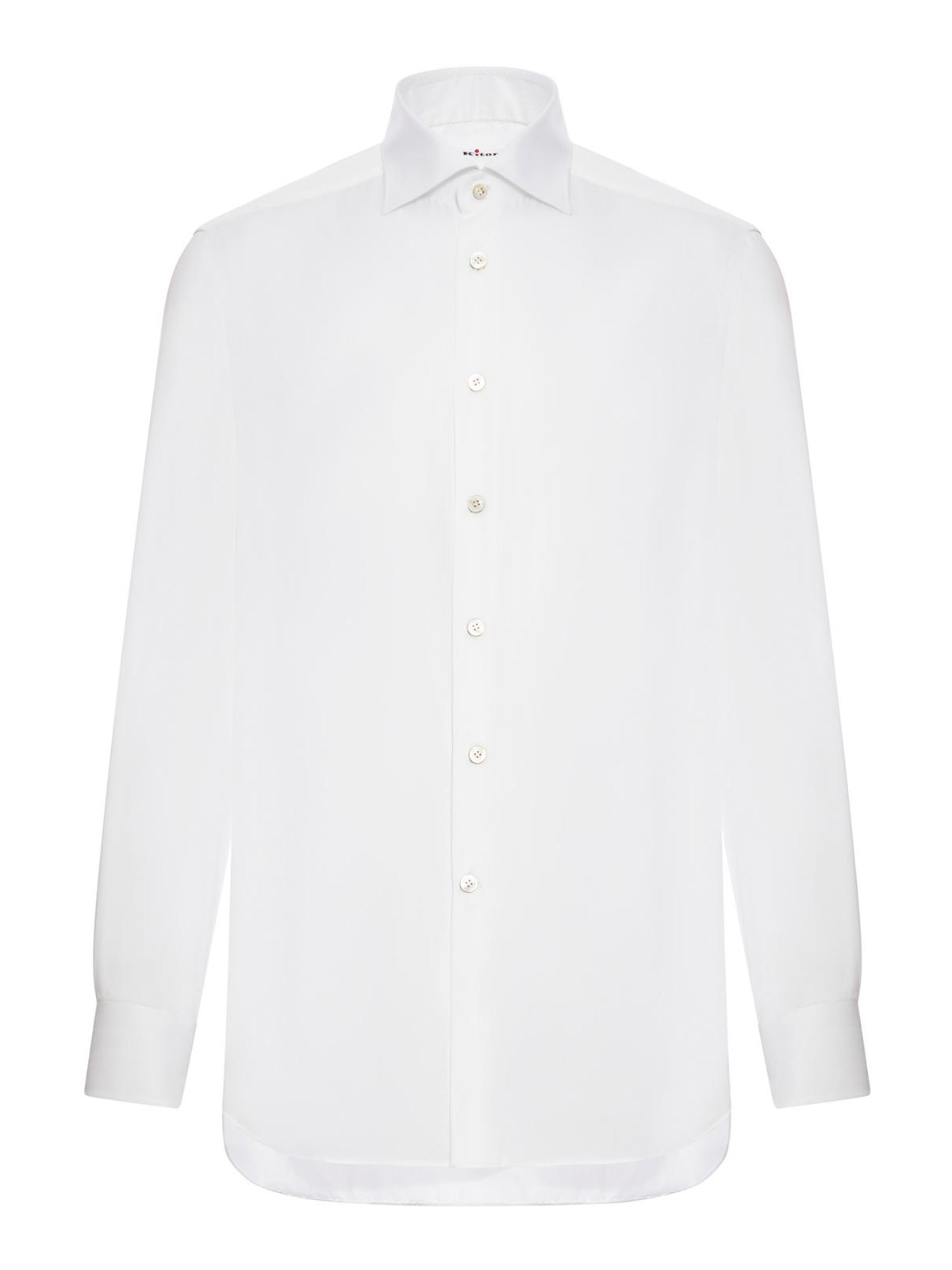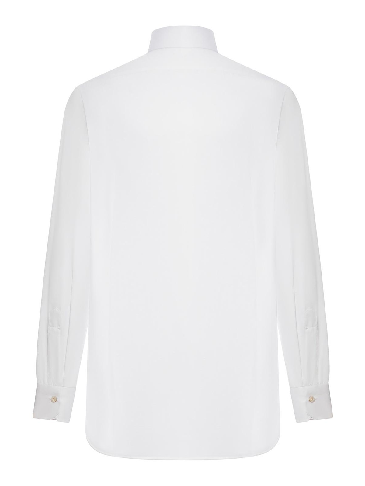Cotton shirt, classic collar, front button closure, mother-of-pearl buttons, long sleeves, buttoned cuffs, asymmetrical curved hem, 100% cotton, color: white