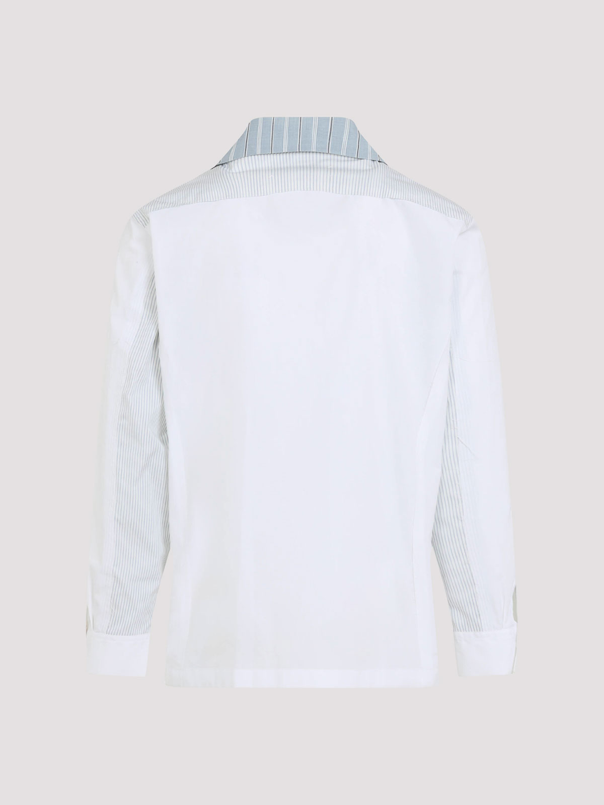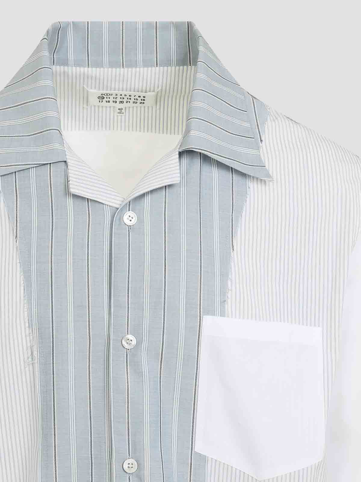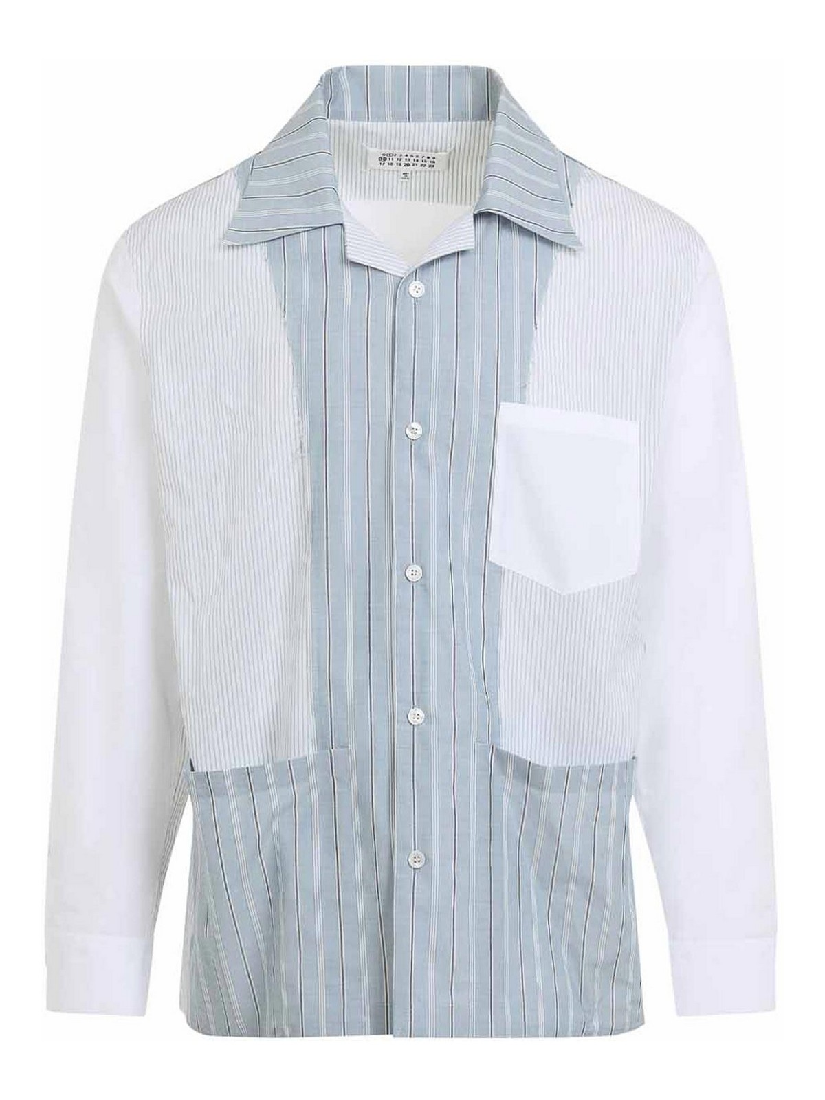 Maison margiela white and blue striped cotton shirt. white and blue striped cotton, bowling collar, long sleeves, front button fastening, multipockets. regular fit, four stitches logo on back panel, regular fit.