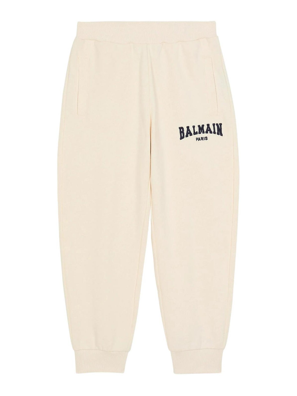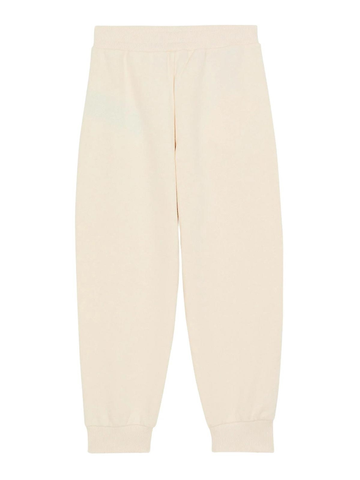 Light beige elasticated waist two side welt pockets embroidered logo on the hems at the ankles