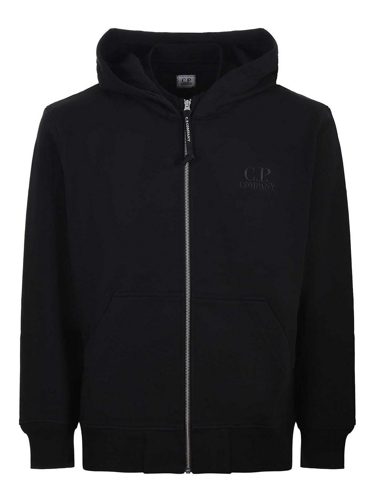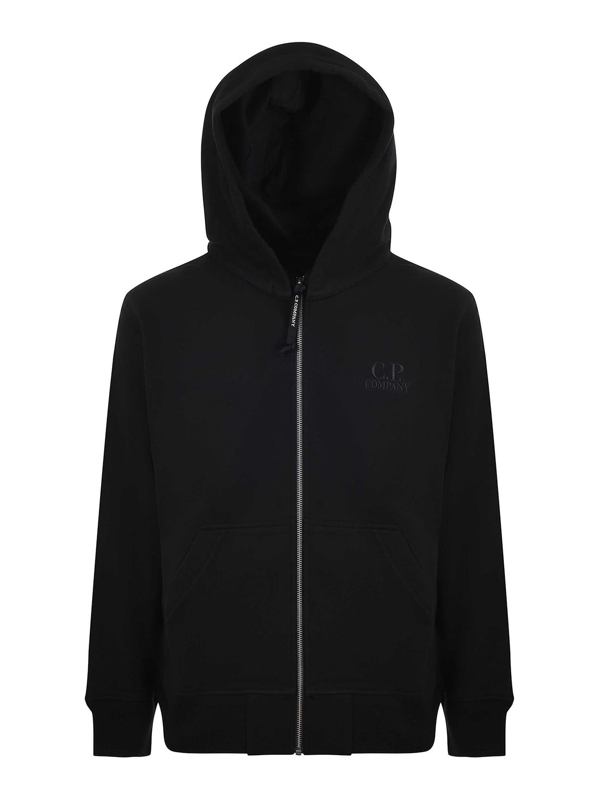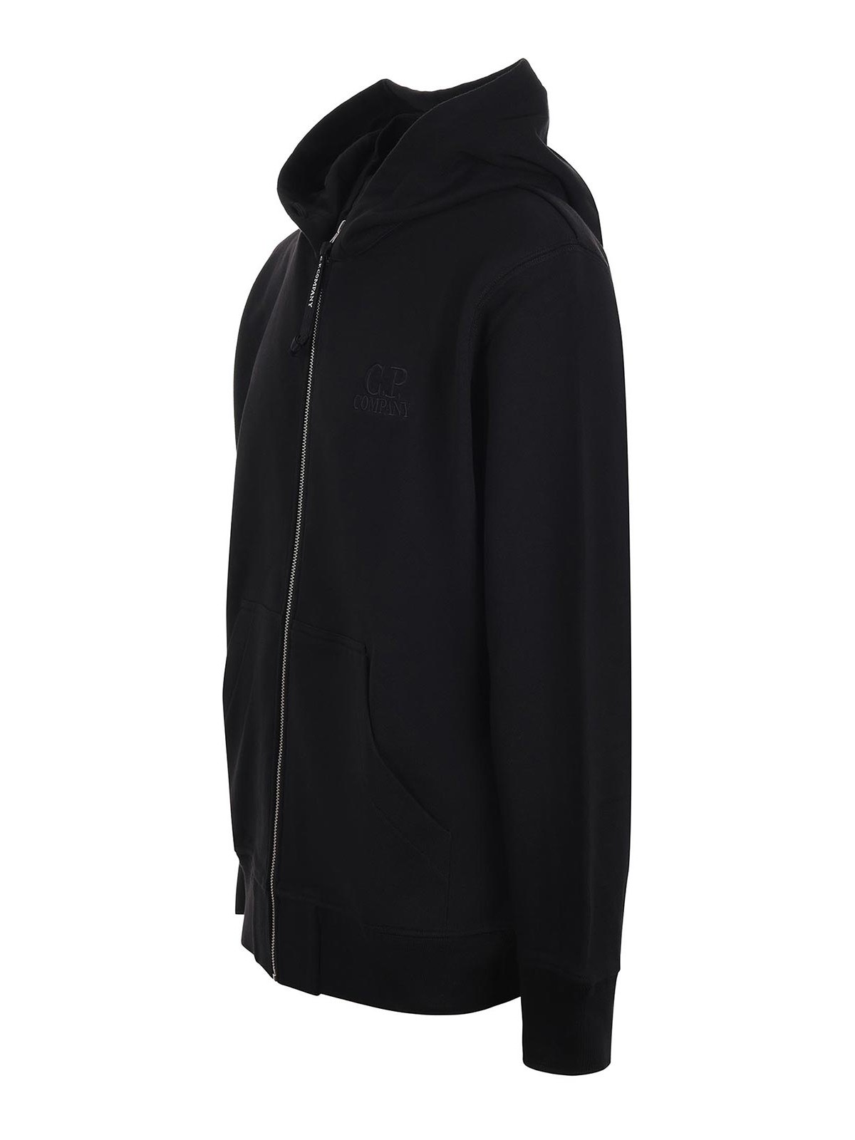 C.p. company cotton sweatshirt. ribbed crewneck with fixed hood. long sleeves. kangaroo pocket. elastic cuffs and hem. brushed interior. zip closure. embroidered front logo. 100% cotton