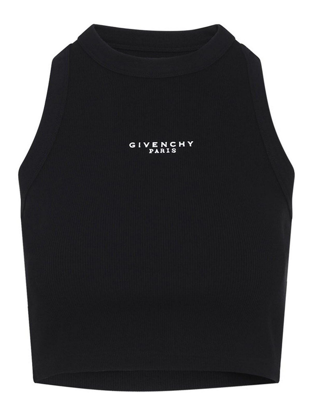 Givenchy black cotton top. cropped tank top crafted from black ribbed cotton, featuring a crew neck, a white contrasting printed logo on the front, and straight hem.
