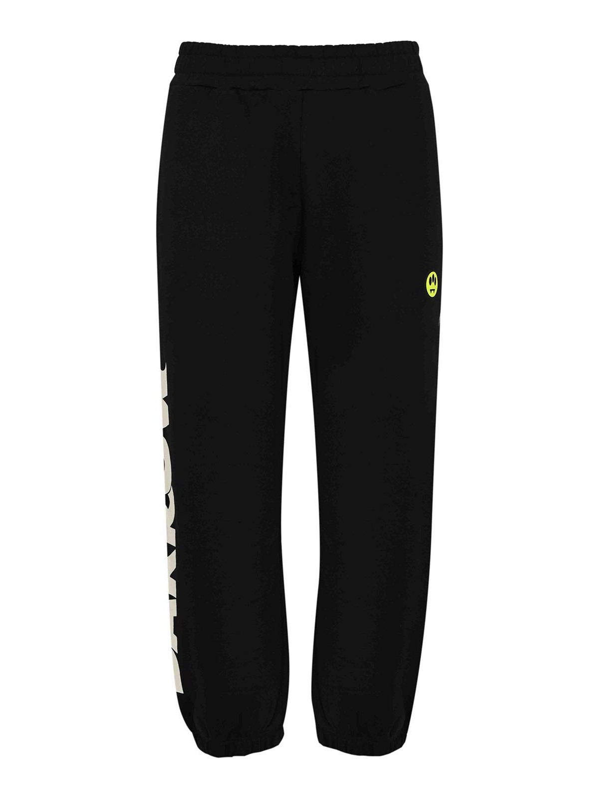 Cotton pants barrow pattern solid black with contrasting side logo print rise mid, rise with elastic waistband no elastic waist pockets two side pockets and one back patch pocket length long with elasticated cuffs barrow logo printed in white along the leg neon yellow smiley face printed on the side tone, on, tone stitching lined no fit regular