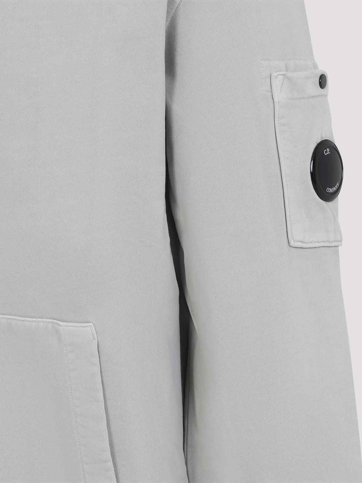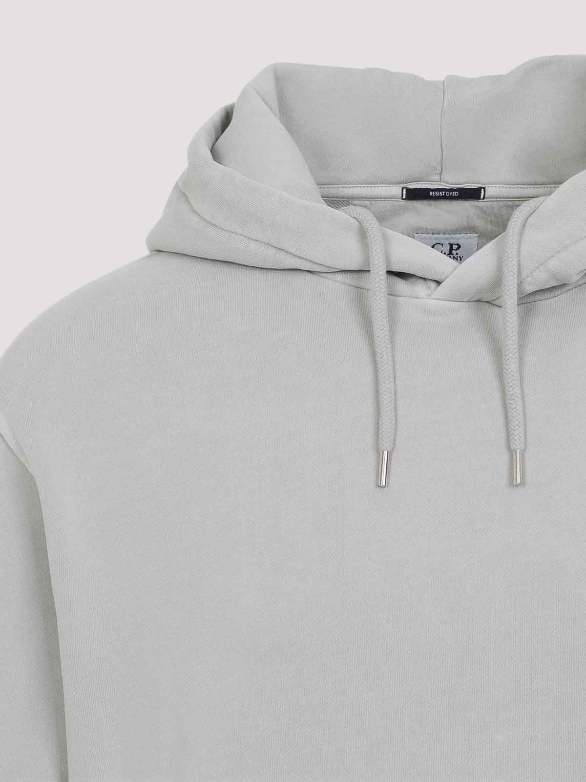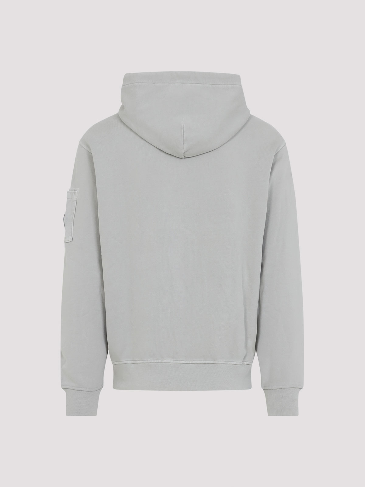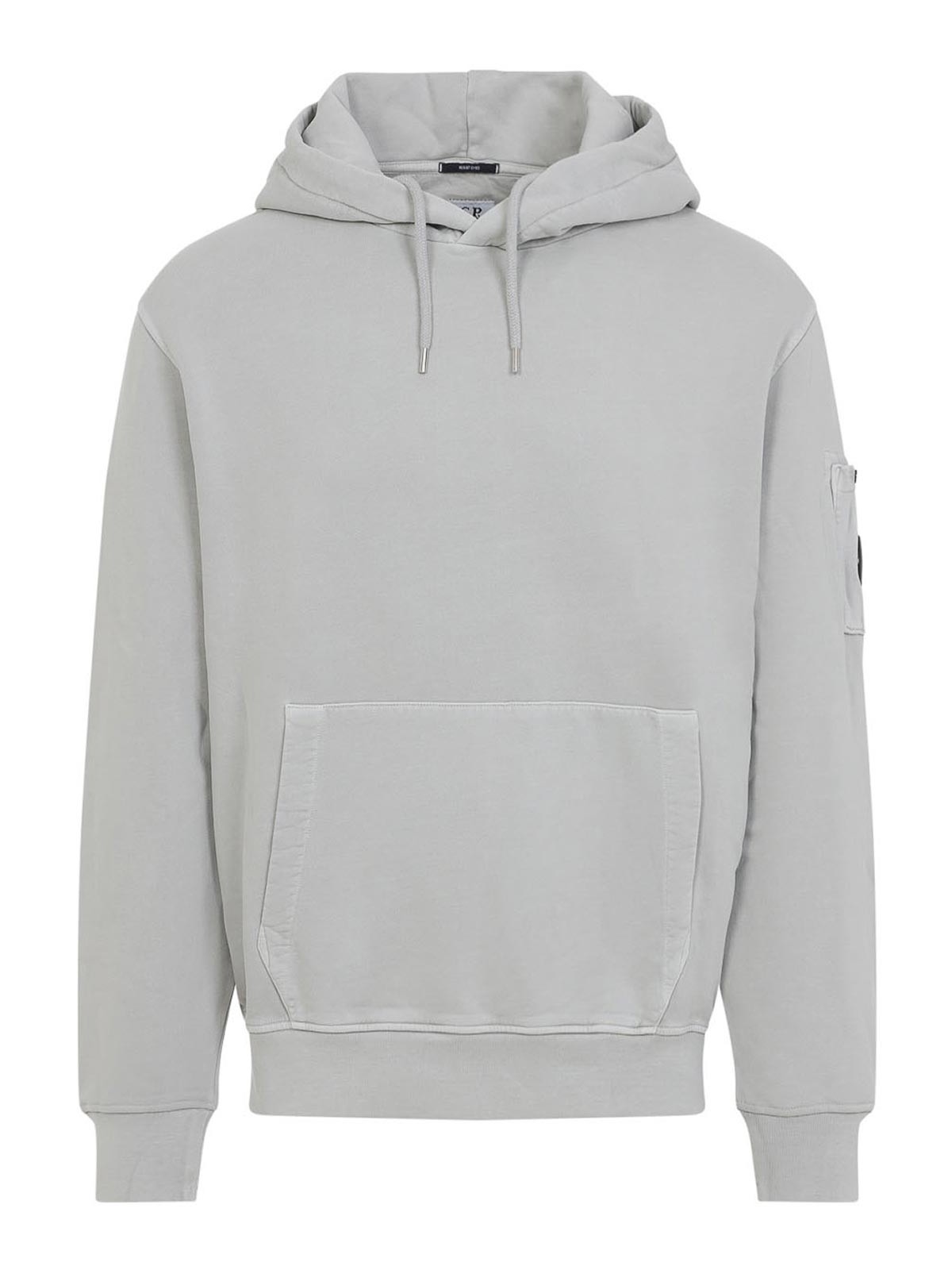 Cp company light grey cotton hoodie. crafted from light grey cotton fleece, hood with drawstring, long sleeves, buttoned pocket with lens detail on the sleeve, kangaroo pocket, fine ribbed edges.