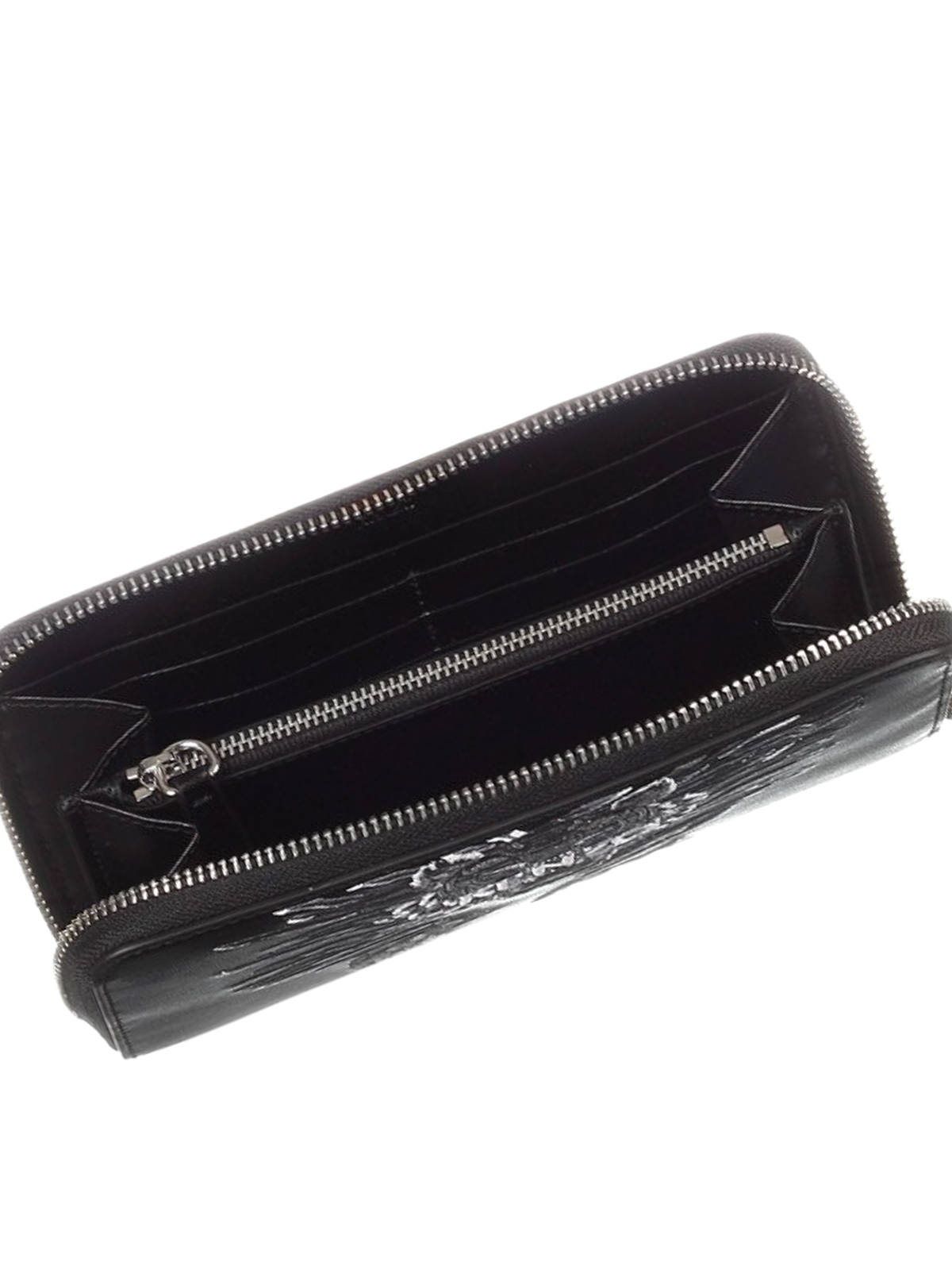 Leather zip around continental wallet featuring front and back Crawling Tiger embroidery, twelve card slots, a zipped pocket and open pockets.