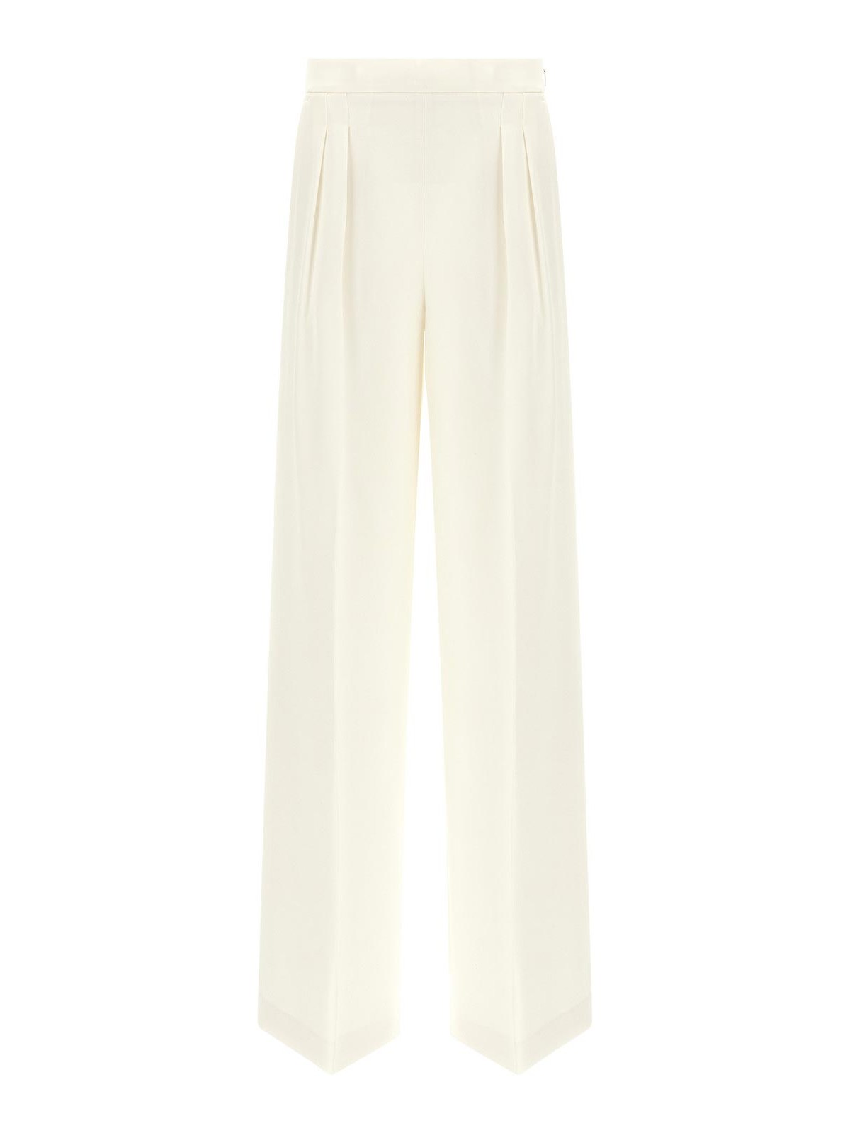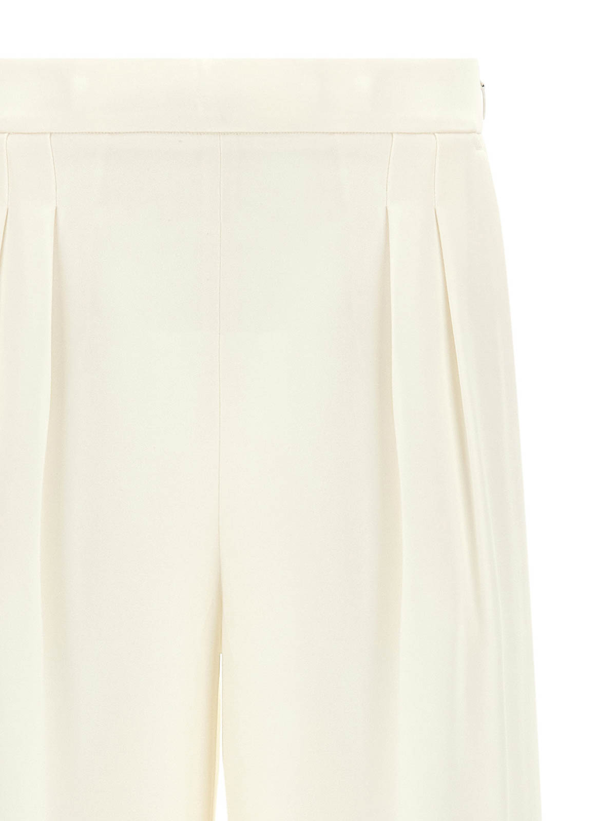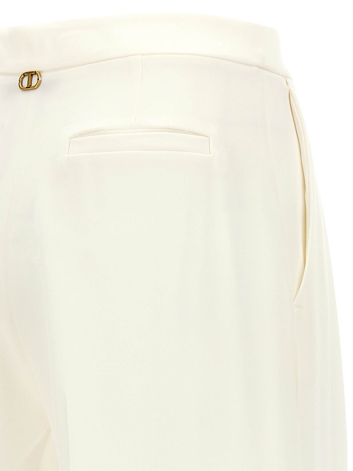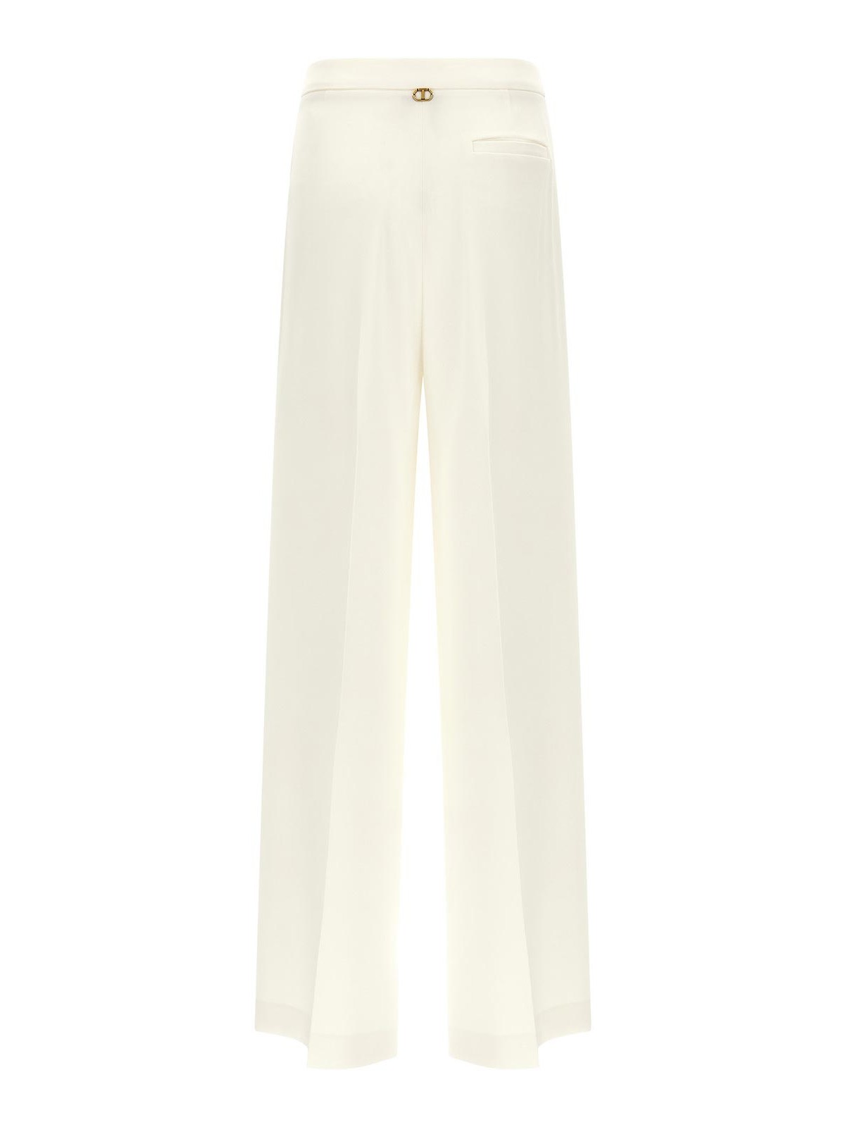 Crepe pants, wide leg, stretched pleat, pleats, side zip closure, pockets, metal oval t logo plaque on the back.