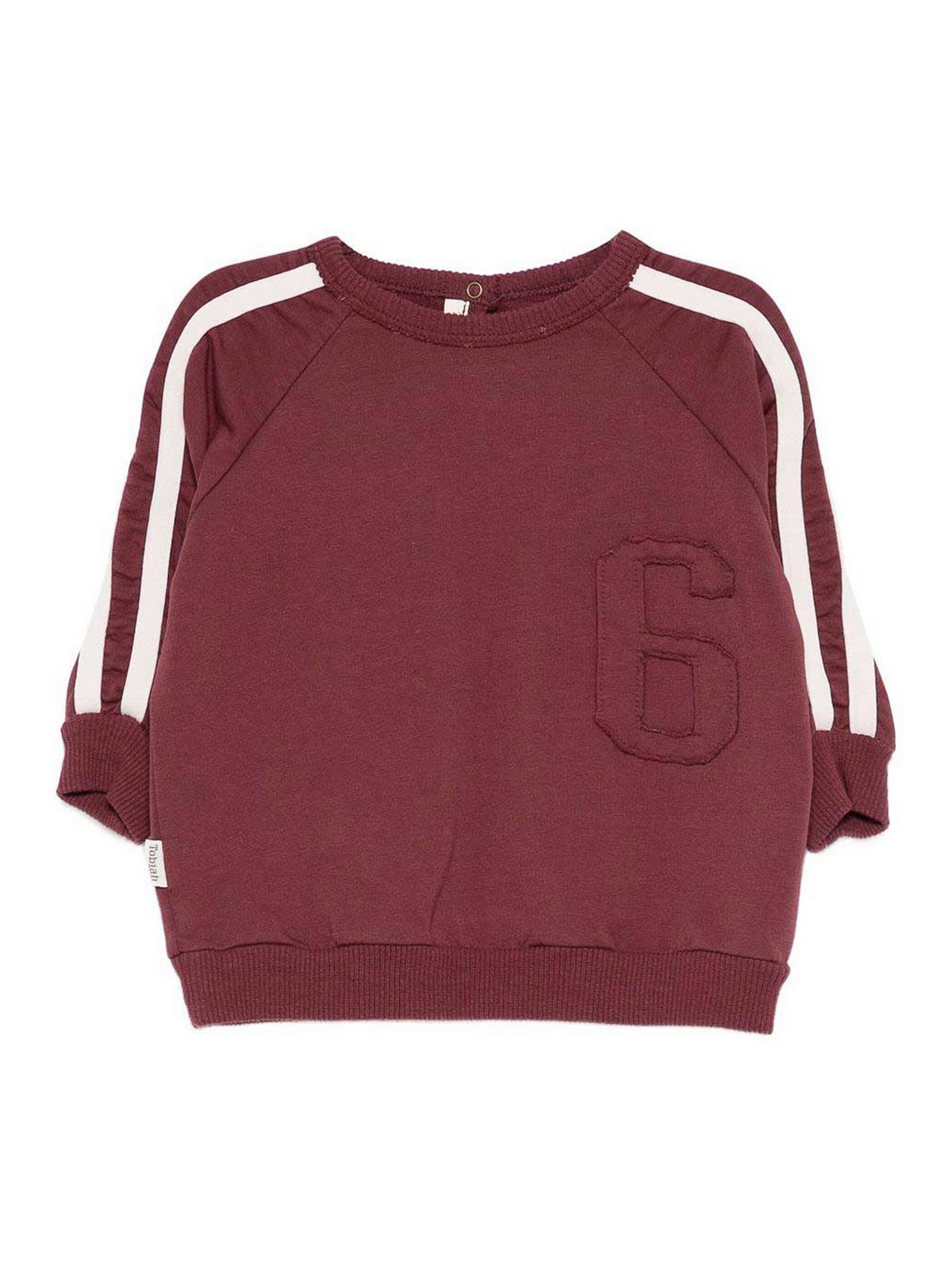 Crewneck sweatshirt features burgundy striped crew neck, long sleeves, back buttoning