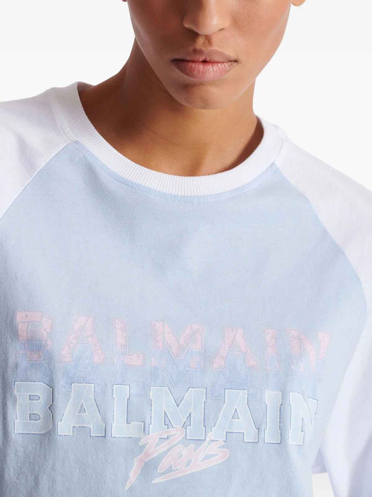 Short organic cotton t-shirt with Balmain Paris logo printed on on the sleeves with round routine neckline with ribbed and modern fit for a casual style, chic with a Parisian touch add it immediately your wardrobe