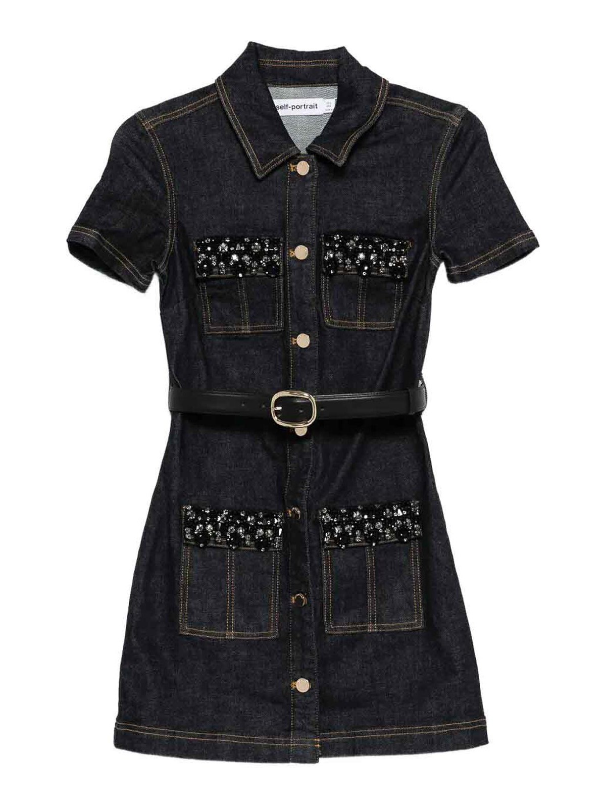 Self Portrait: short dresses - Denim Crystal Trim Mini Dress