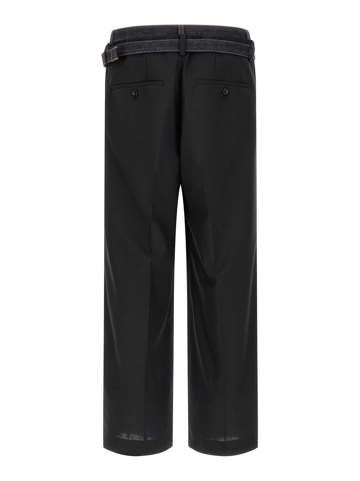 Wool blend trousers, double layer waist with denim insert with contrast stitching, wide and straight leg, stretched pleat, front zip and button closure, pockets, removable denim belt.