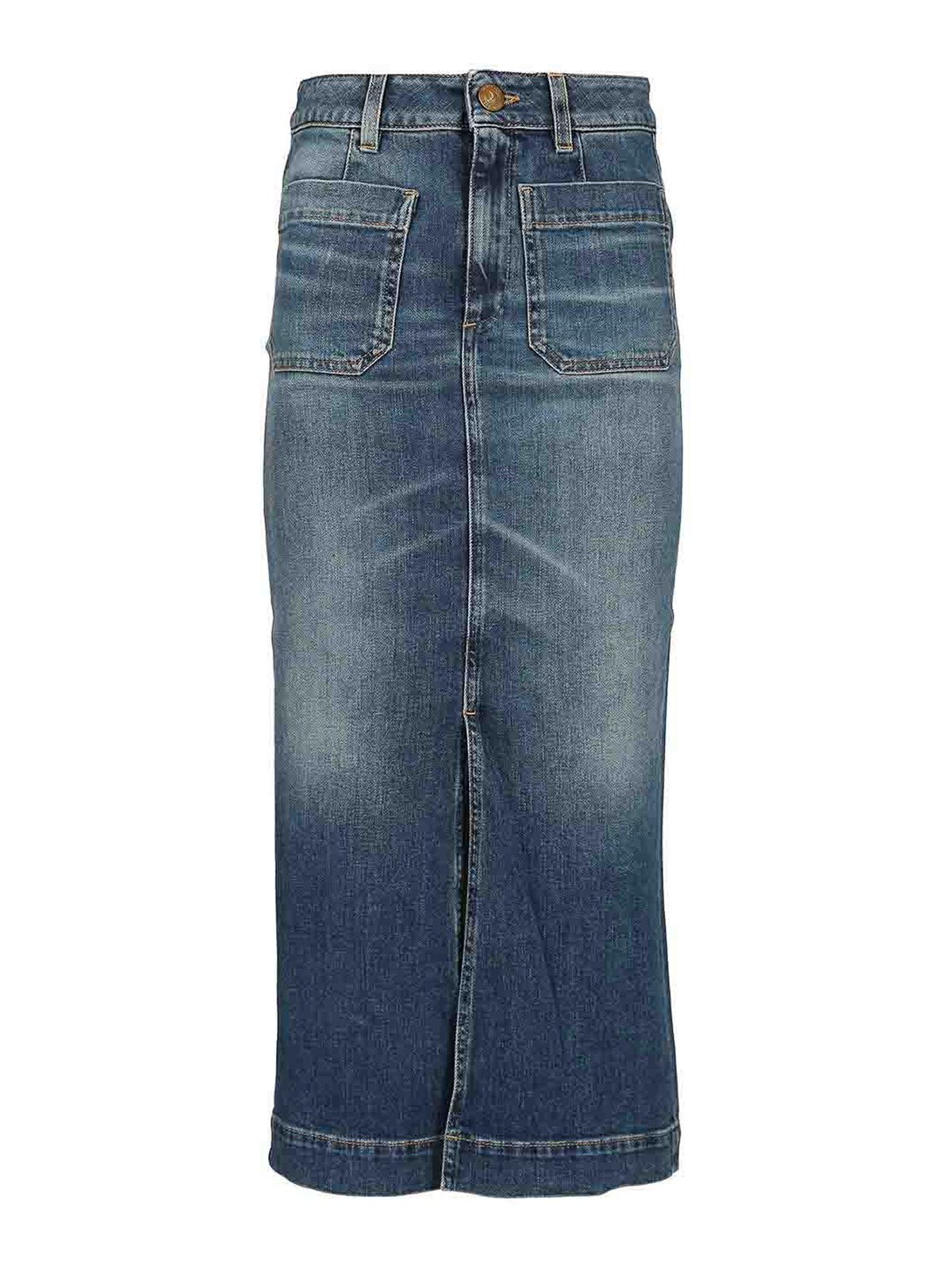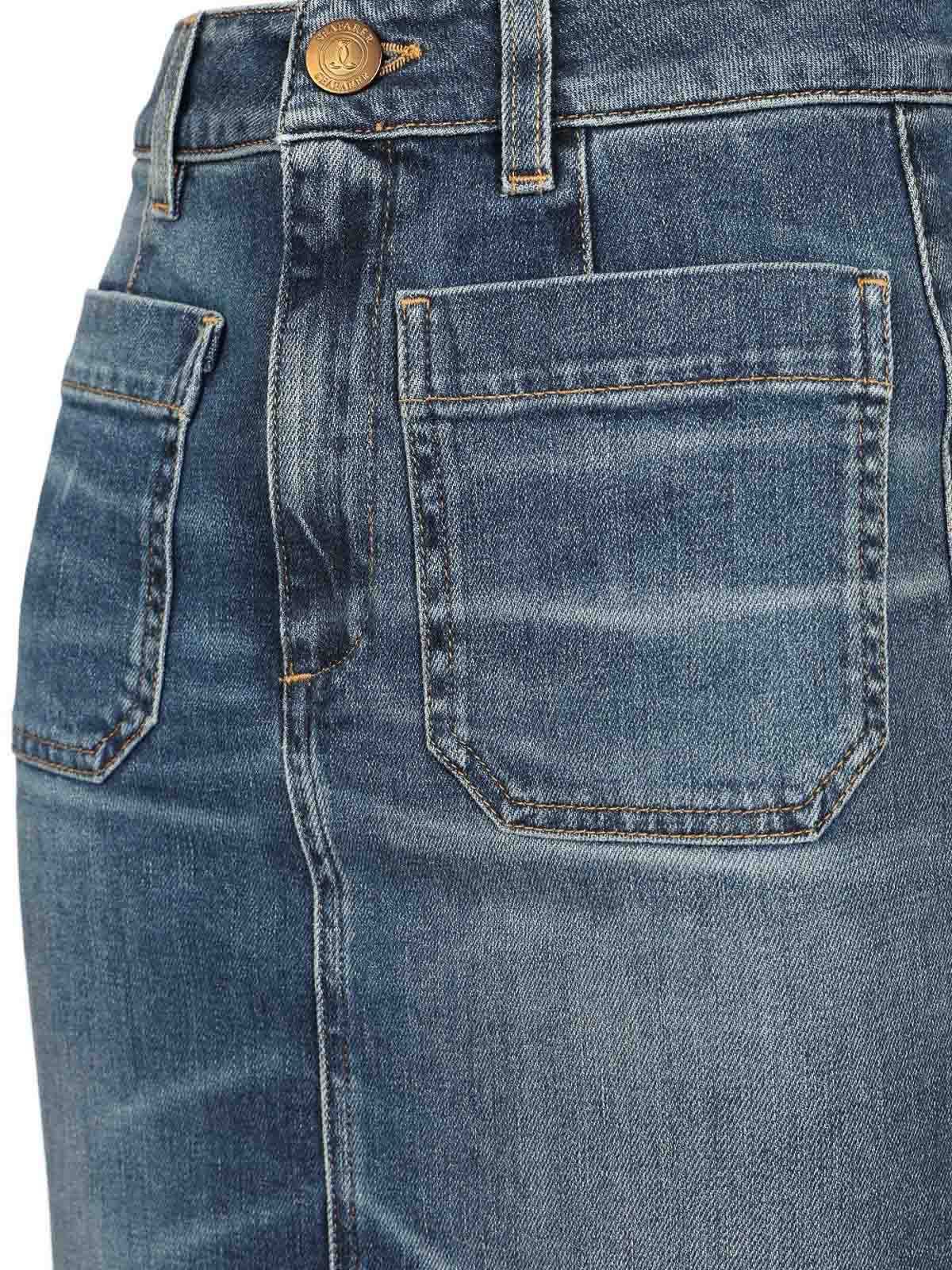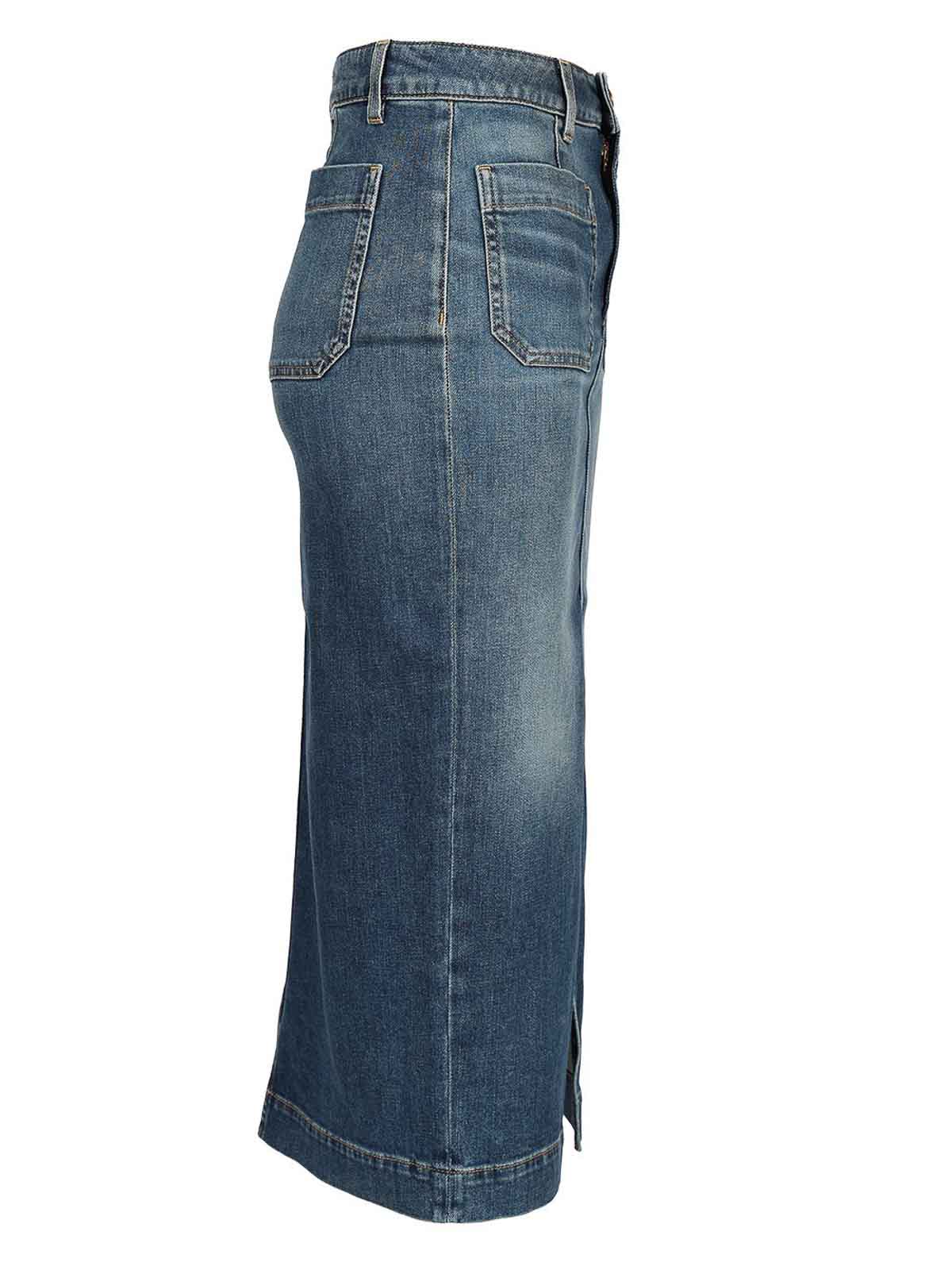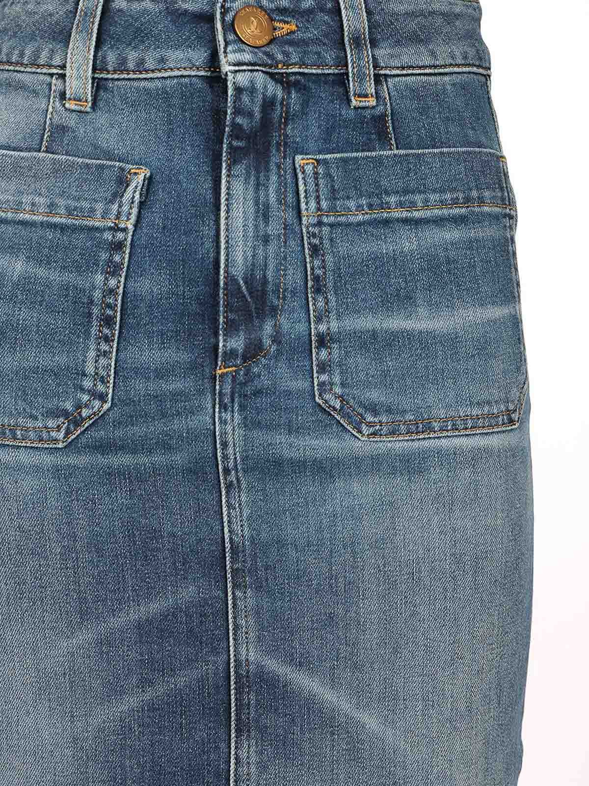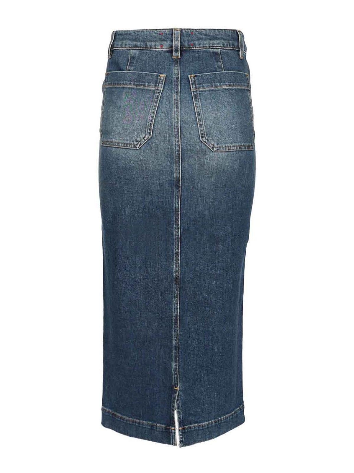 Long denim skirt anne from seafarer made of stonewashed blue stretch denim, with high flap pockets, patched back pockets, front and back slit.