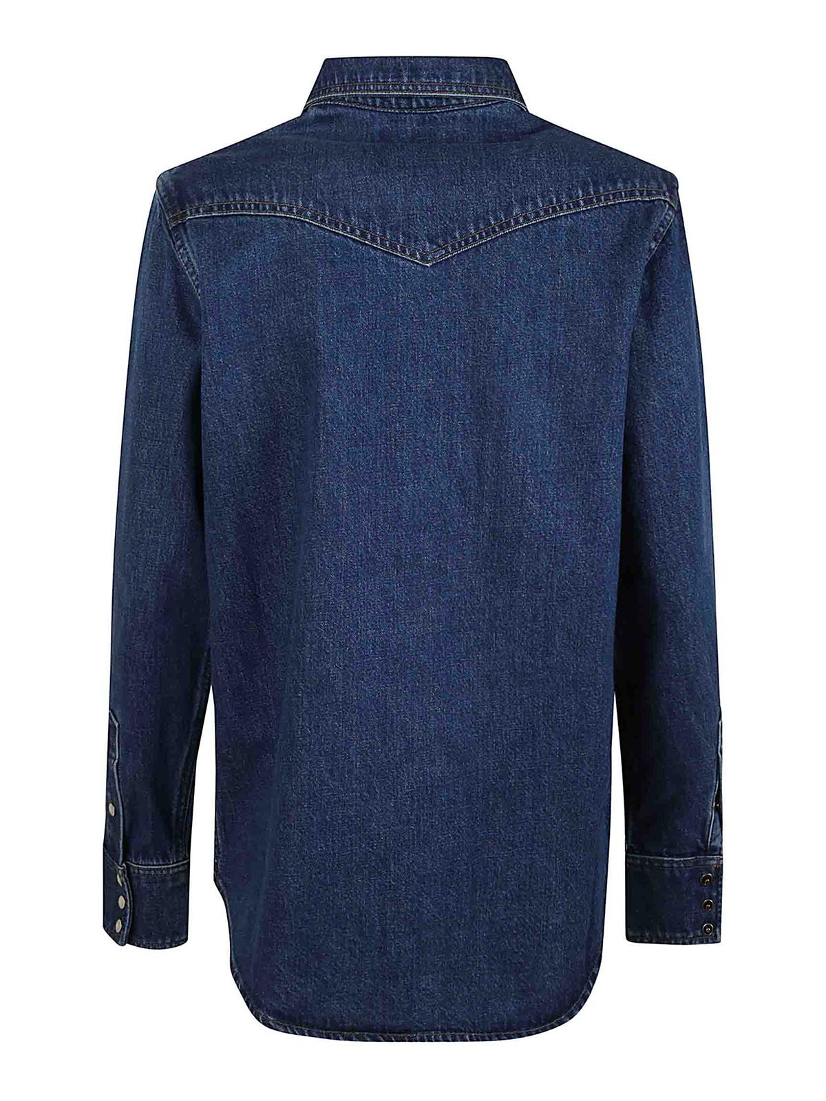 Texan shirt in medium indigo denim, snap button fastening, pointed collar, patch pockets with buttons on the chest.