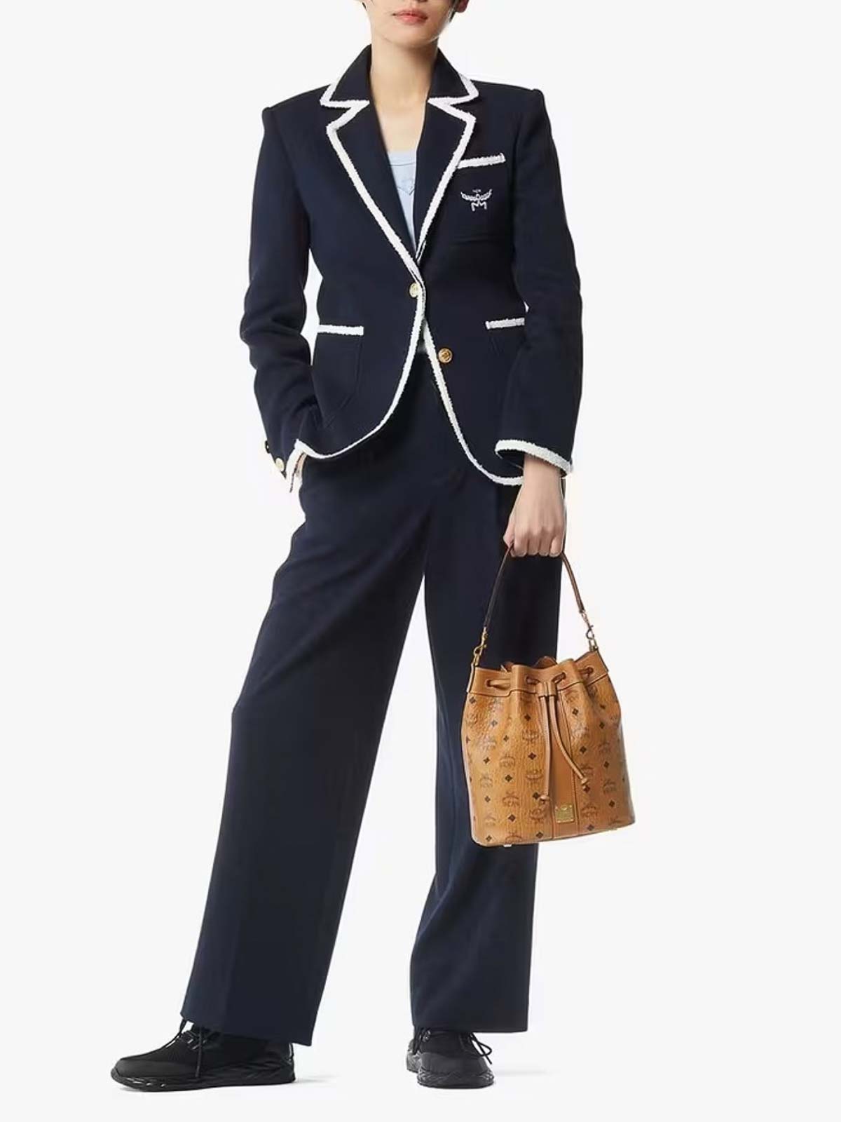 designer color: brown, polyurethane blend, leather trim, monogram motif, drawstring closure, adjustable strap, interior pocket.