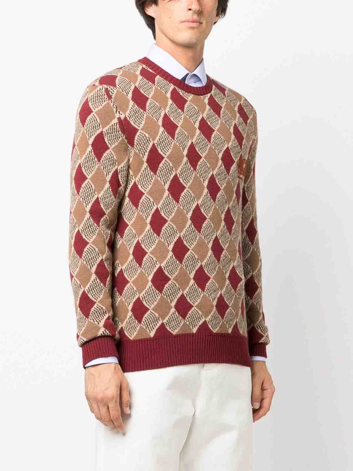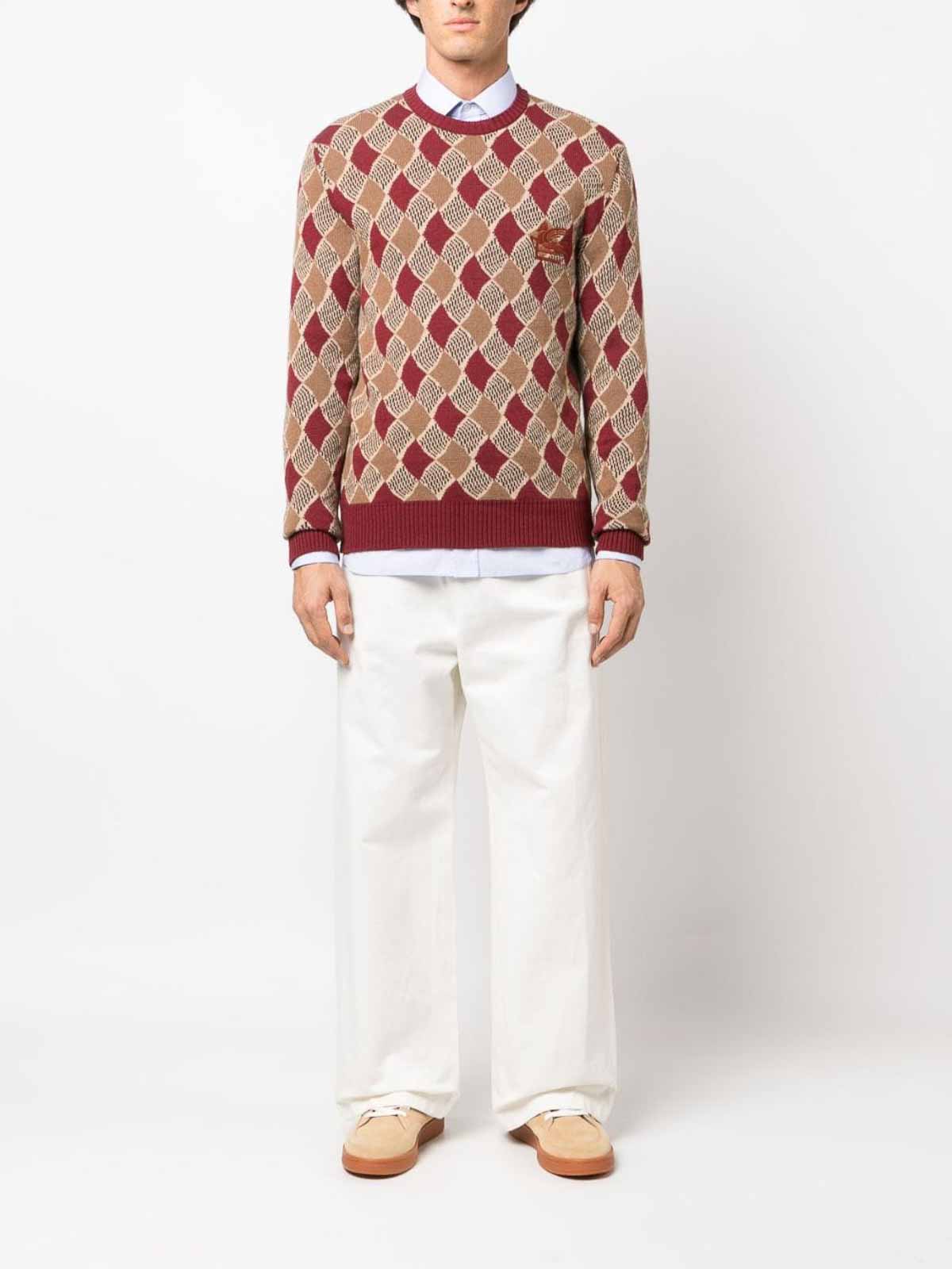 Diamond-pattern wool jumper from etro featuring dark red sand beige ochre brown wool diamond pattern embroidered logo at the chest signature pegaso motif long sleeves crew neck and ribbed cuffs and hem size standard
