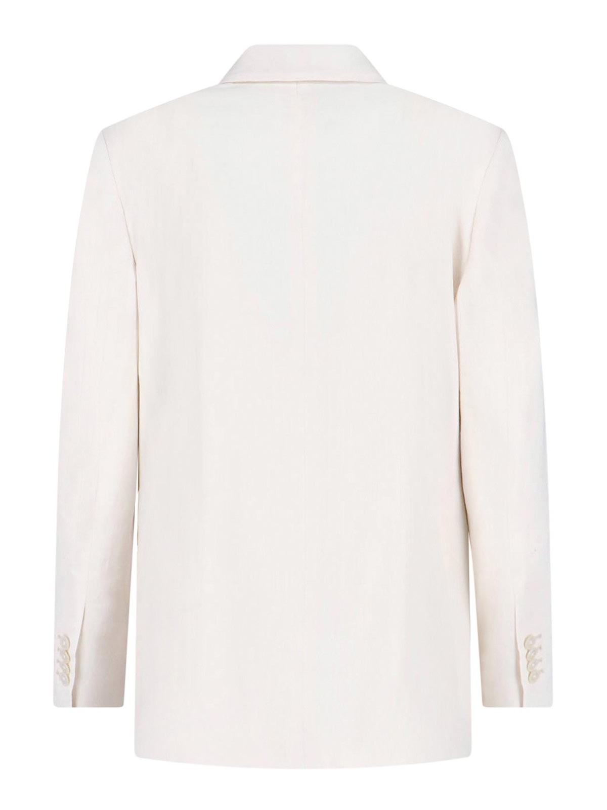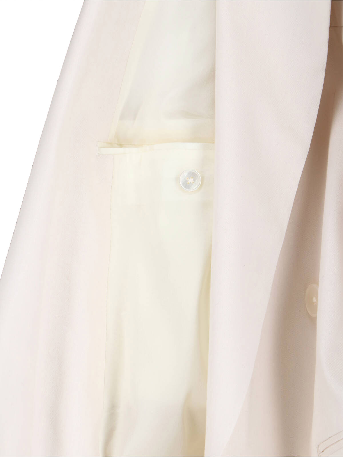 Lardini double-breasted blazer, in cream linen blend, peak lapels with removable brooch detail, button closure, one flat chest pocket, two front welt pockets, buttoned cuffs, straight hem.