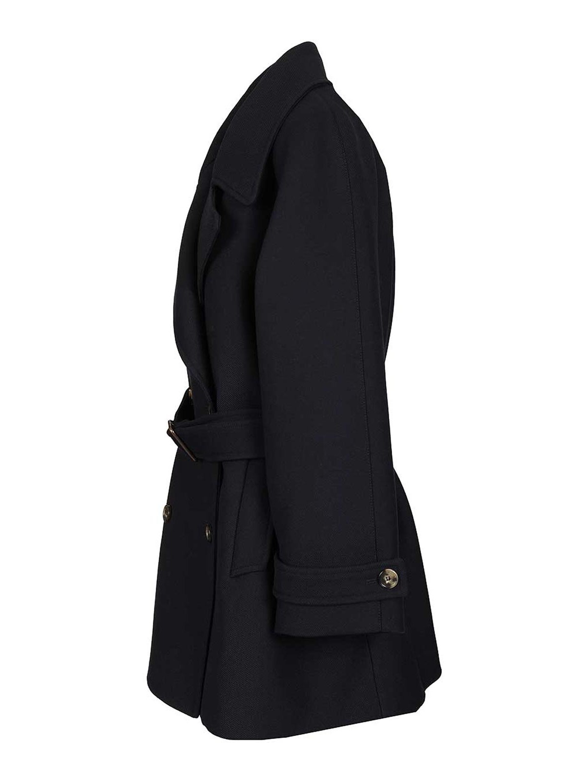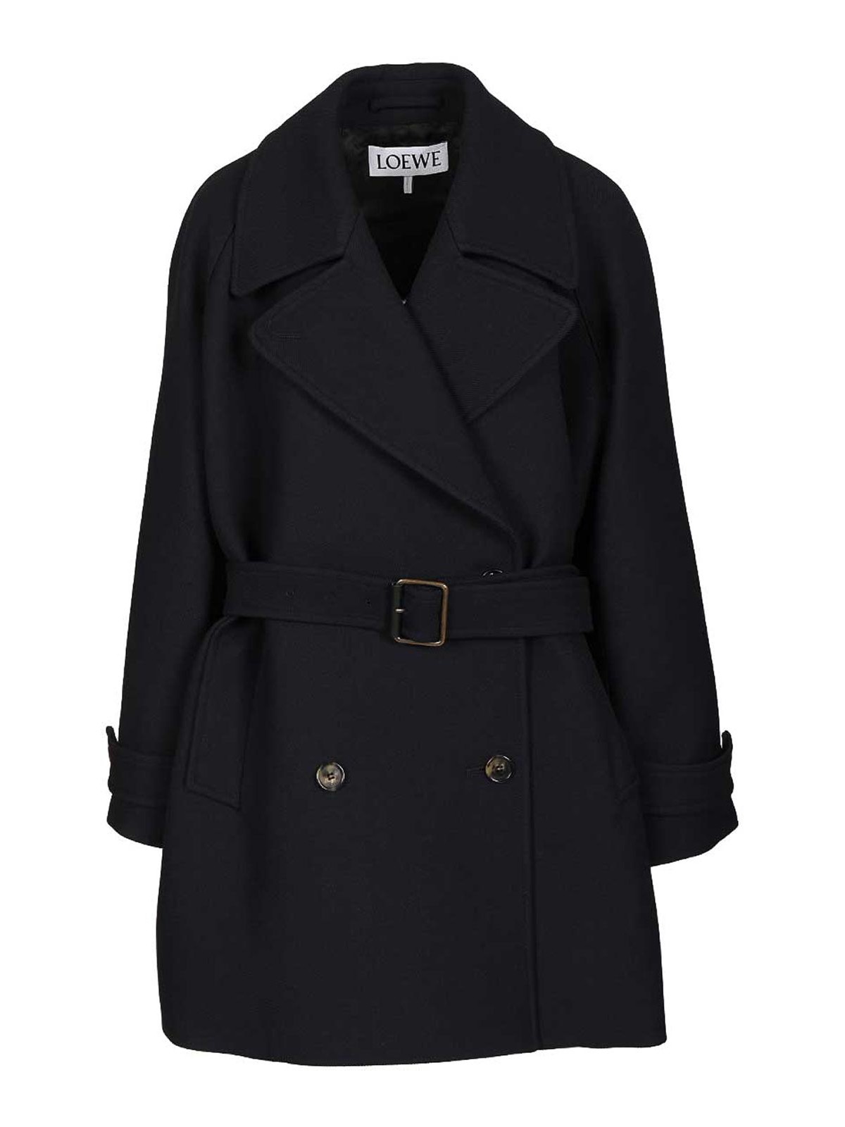 Double-breasted coat in double-faced wool blend drill from loewe, featuring a relaxed fit, a cropped length, notched lapels, a front button fastening, buttoned cuffs, a detachable belt and vertical welt pocket, and an internal leather patch pocket with an embossed anagram motif.