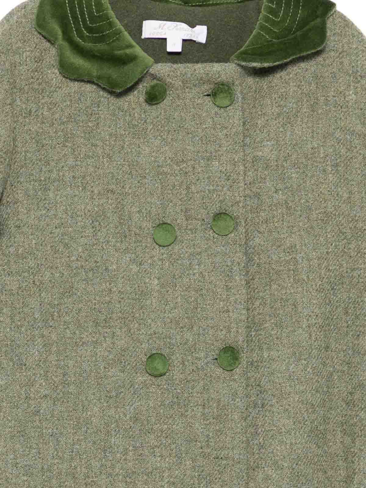 Double breasted coat features green trim double breasted scalloped hem with buttons long sleeves crew neck
