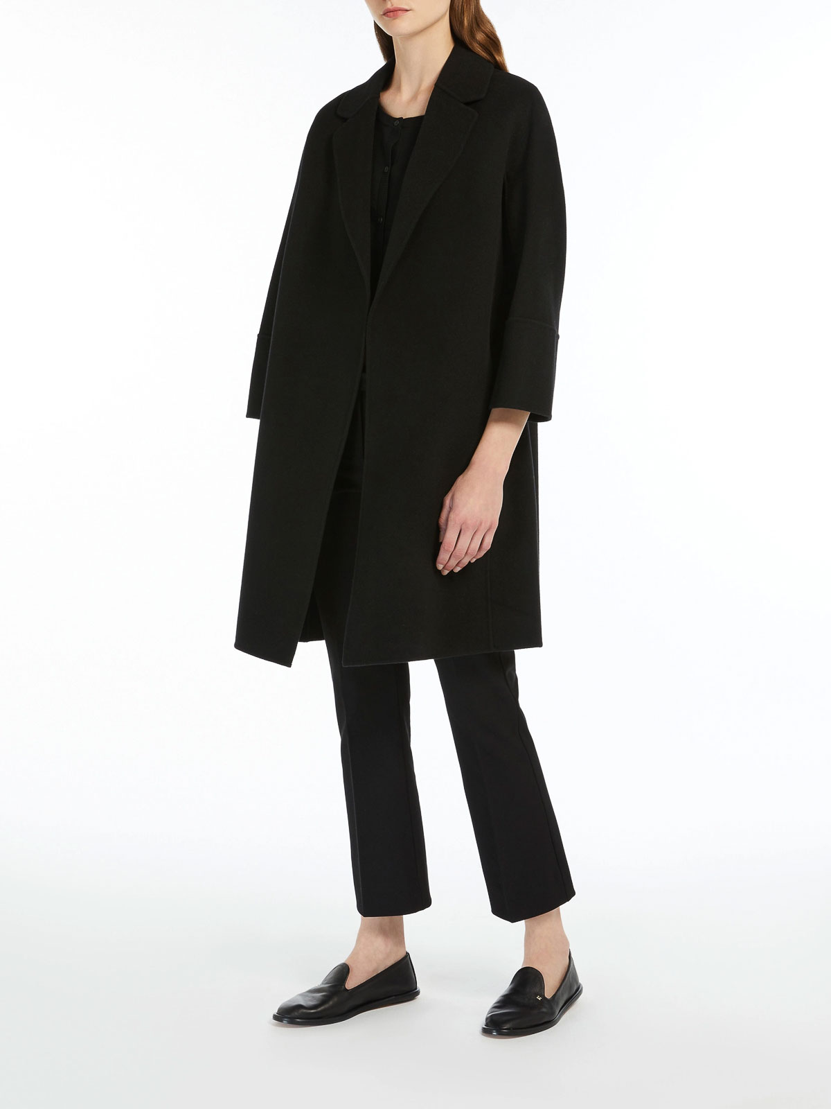 Hand-sewn double-drap pure wool coat wide fit, slightly cinched at the hem small lapel collar kimono sleeves on the front, raglan sleeves on the back matching belt closure inset side pockets unlined
