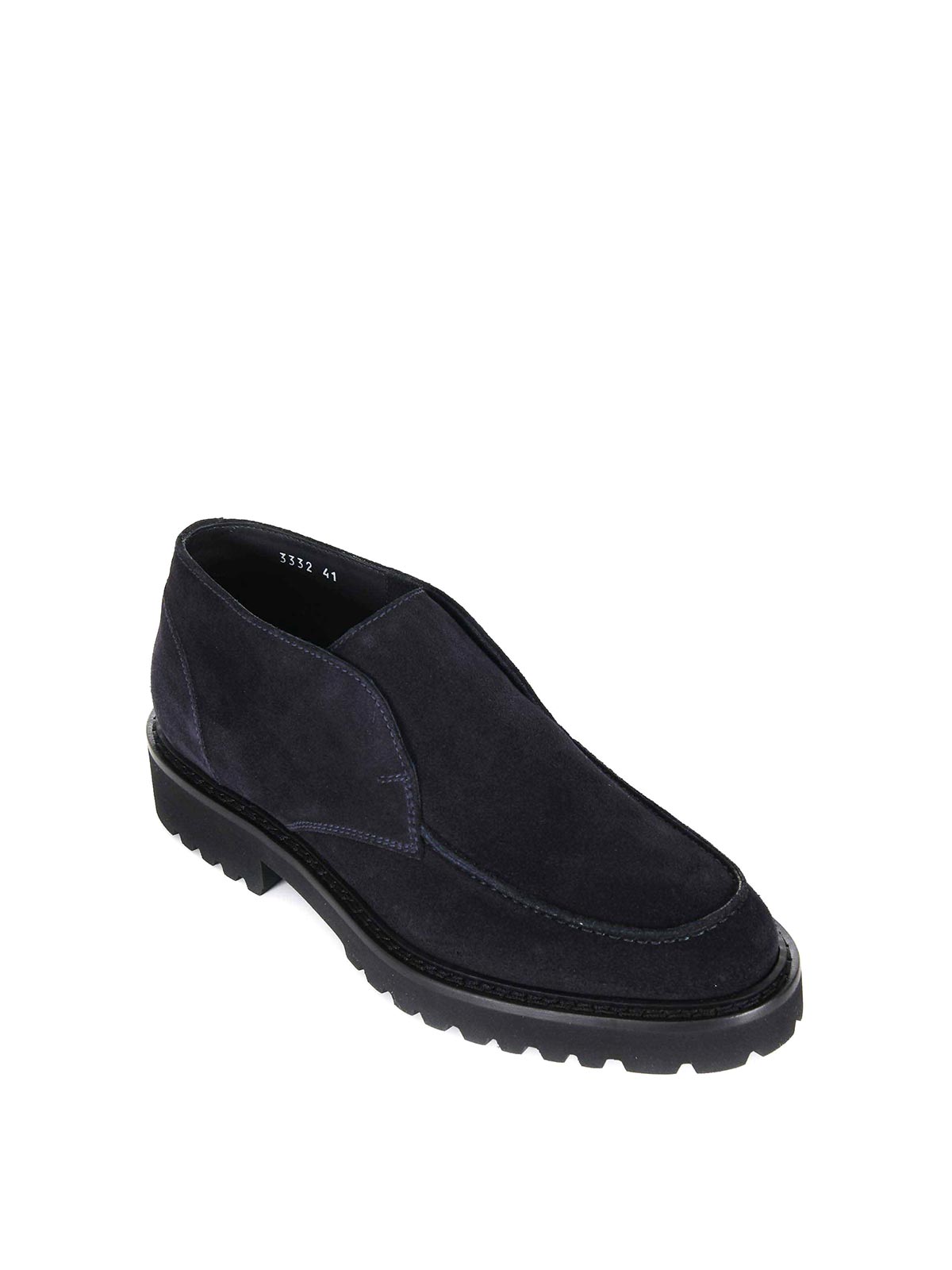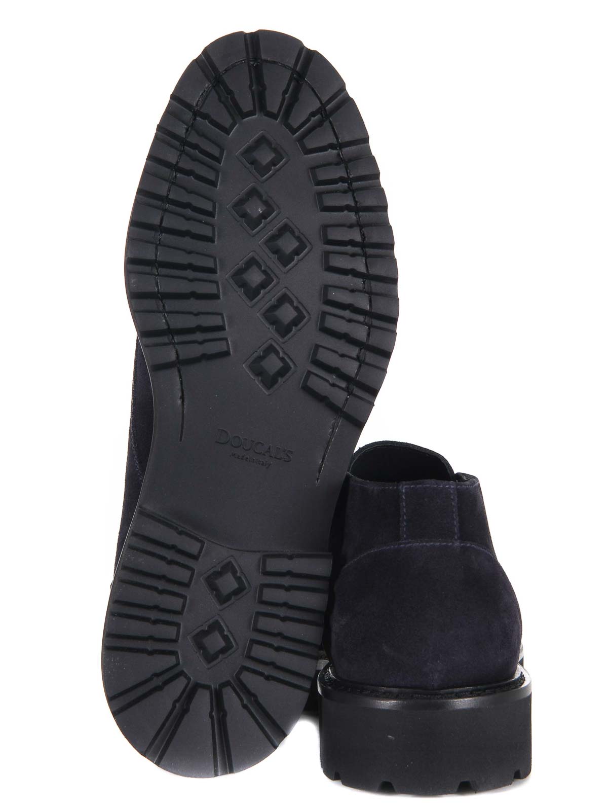 Doucal's dark blue suede ankle boot. elasticated inserts on the sides. lace-up. raised stitching on the upper. rubber sole. 30 mm heel. 100% leather