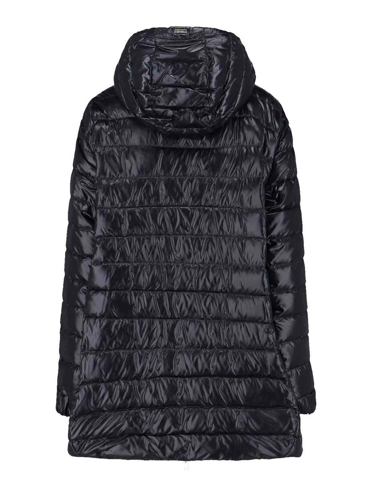 Herno a-shape down jacket in black fabric, hood, zip closure, long sleeves, two side zip pockets, straight flared hem.
