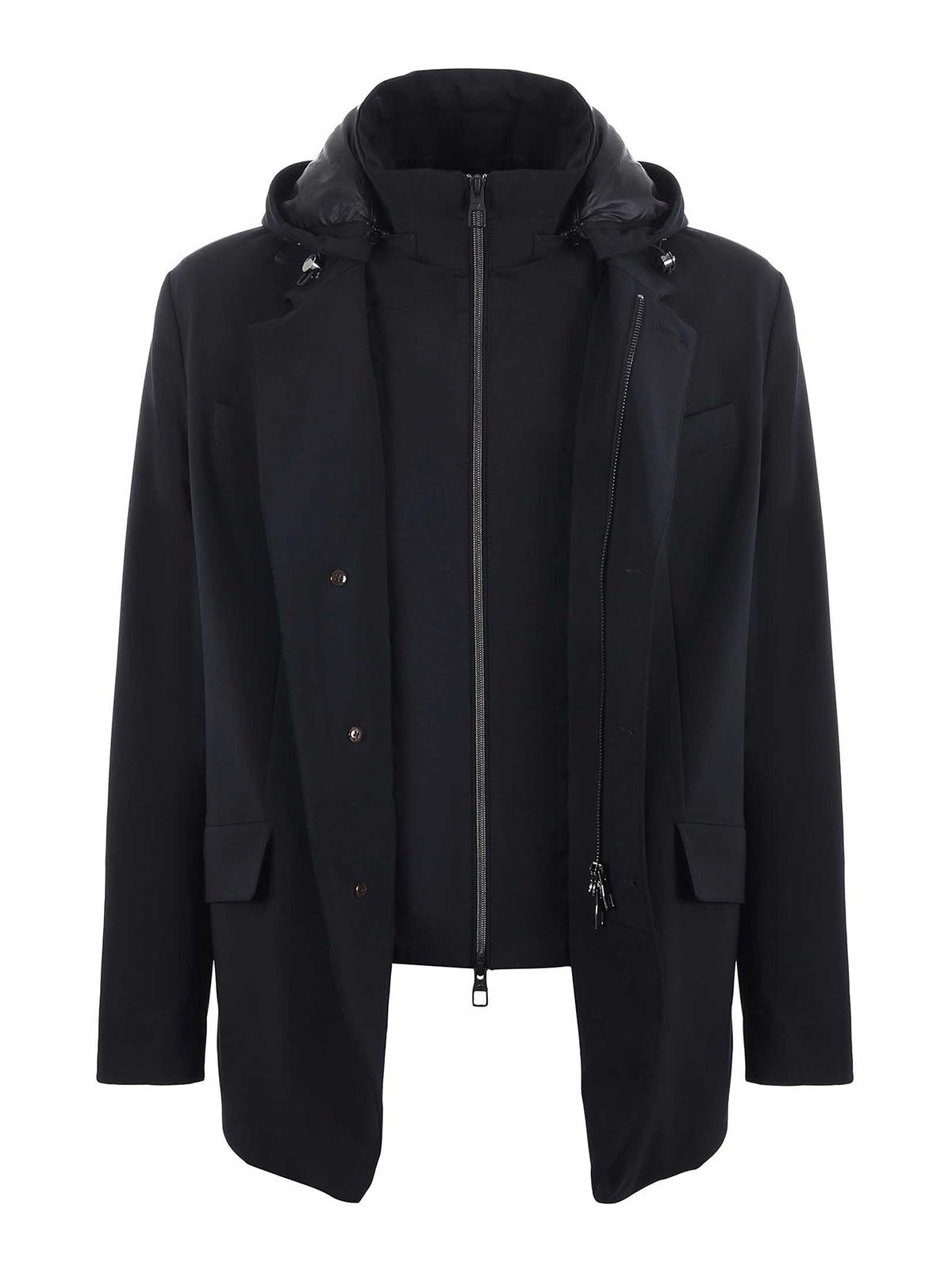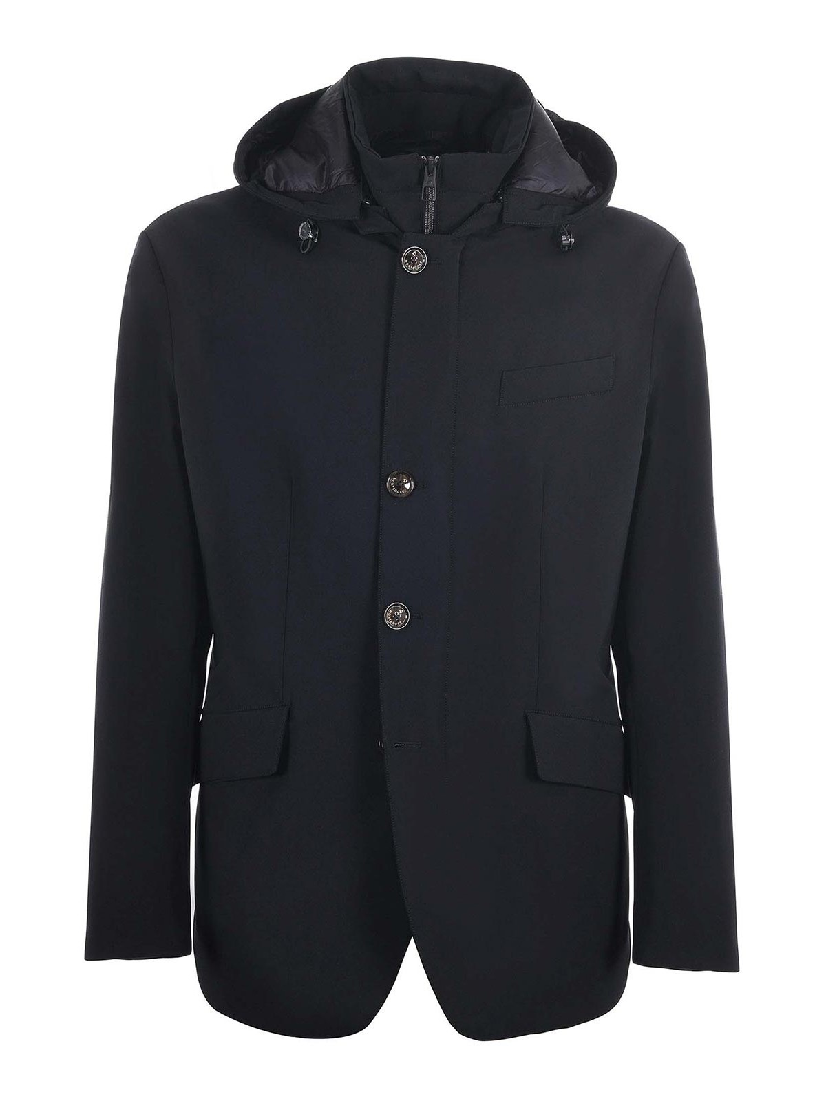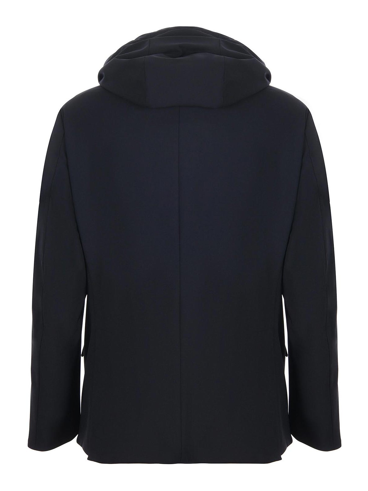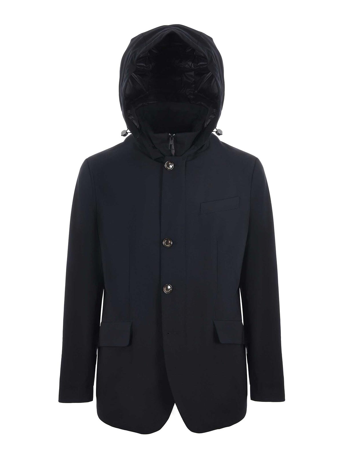 Montecore down jacket in stretch nylon. dark blue. lightweight padding with natural down. double-faced construction with nylon front, high collar, and zip closure. removable hood. zip and button closure. flap pockets. chest pocket. inside zip pocket. internal logo patch. size shown: m 91% polyester, 9% elastane filling: 90% down, 10% feathers