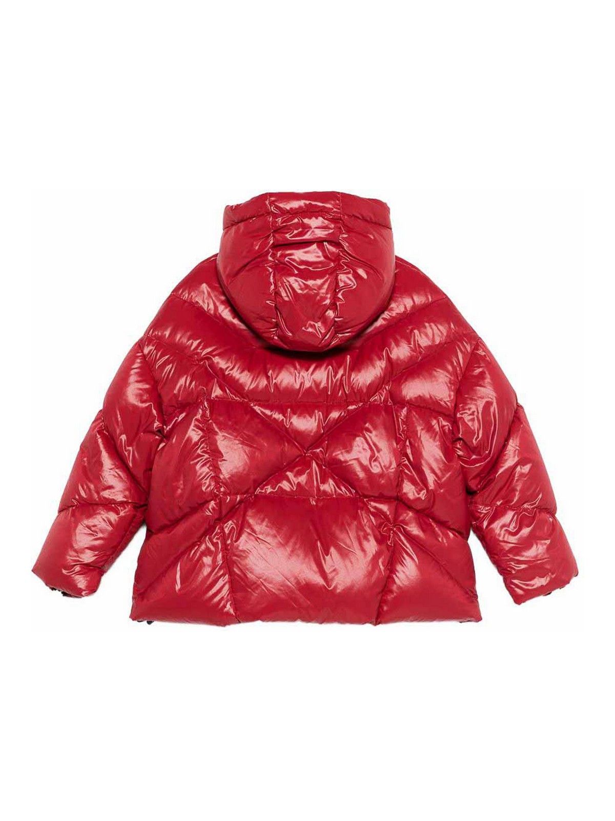 Quilted hooded down jacket features red quilted design, zipped drawstring hood, zipped cuffs