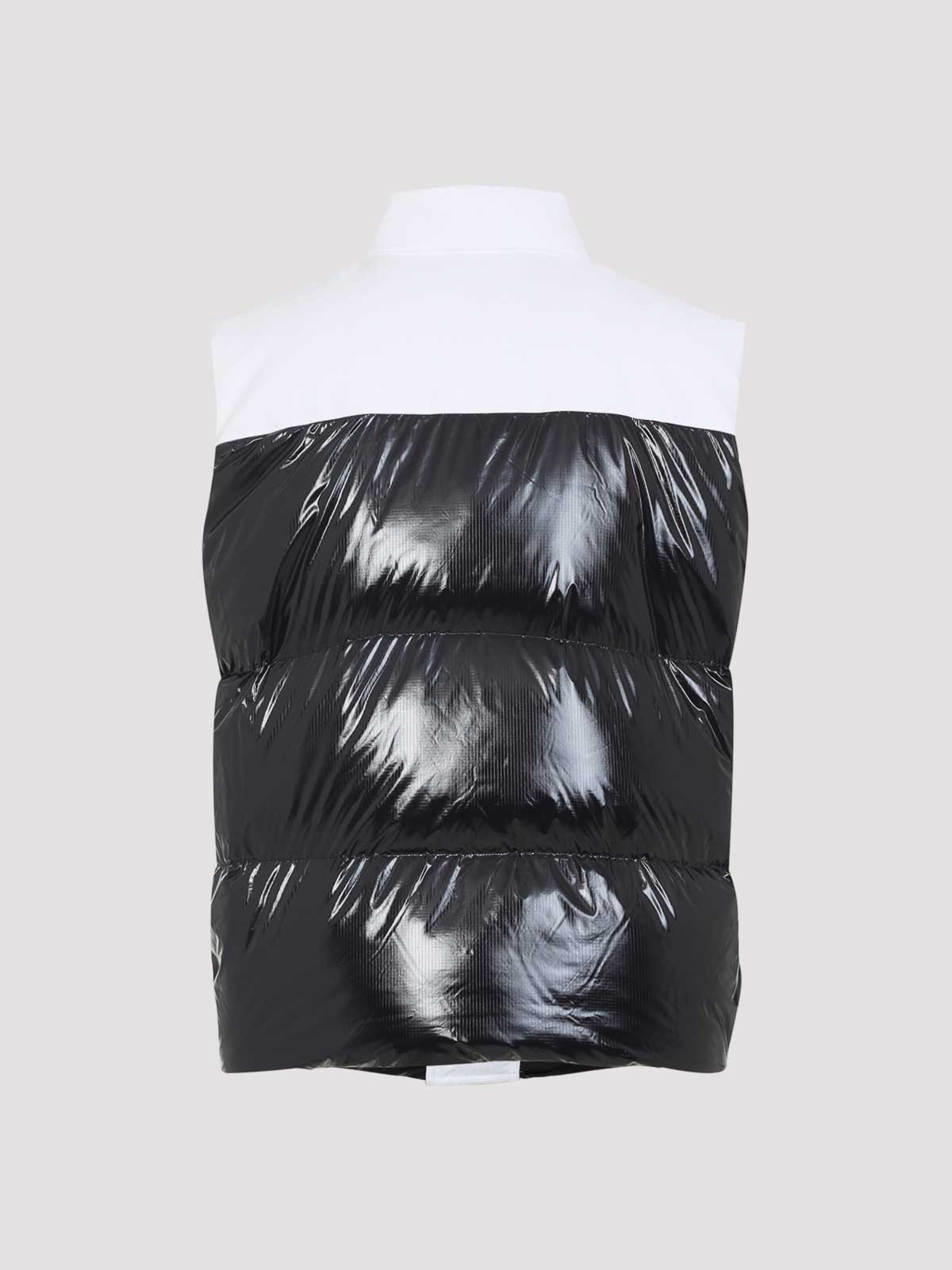 Casablanca black vest crafted stand, up collar concealing zipped chest patch logo side pockets side buckle sleeveless straight hem black and white