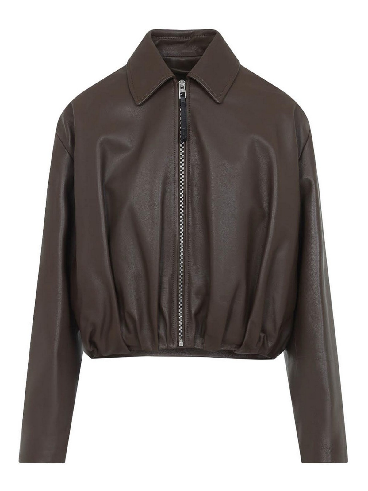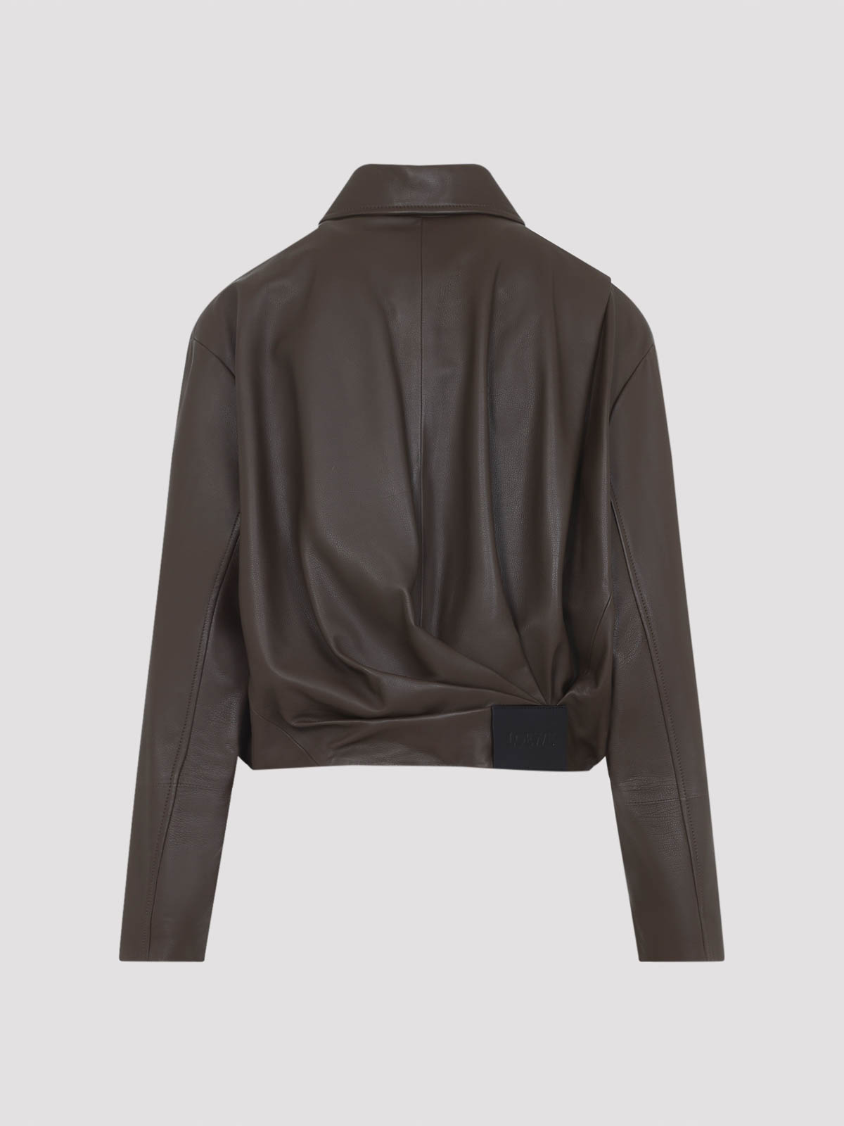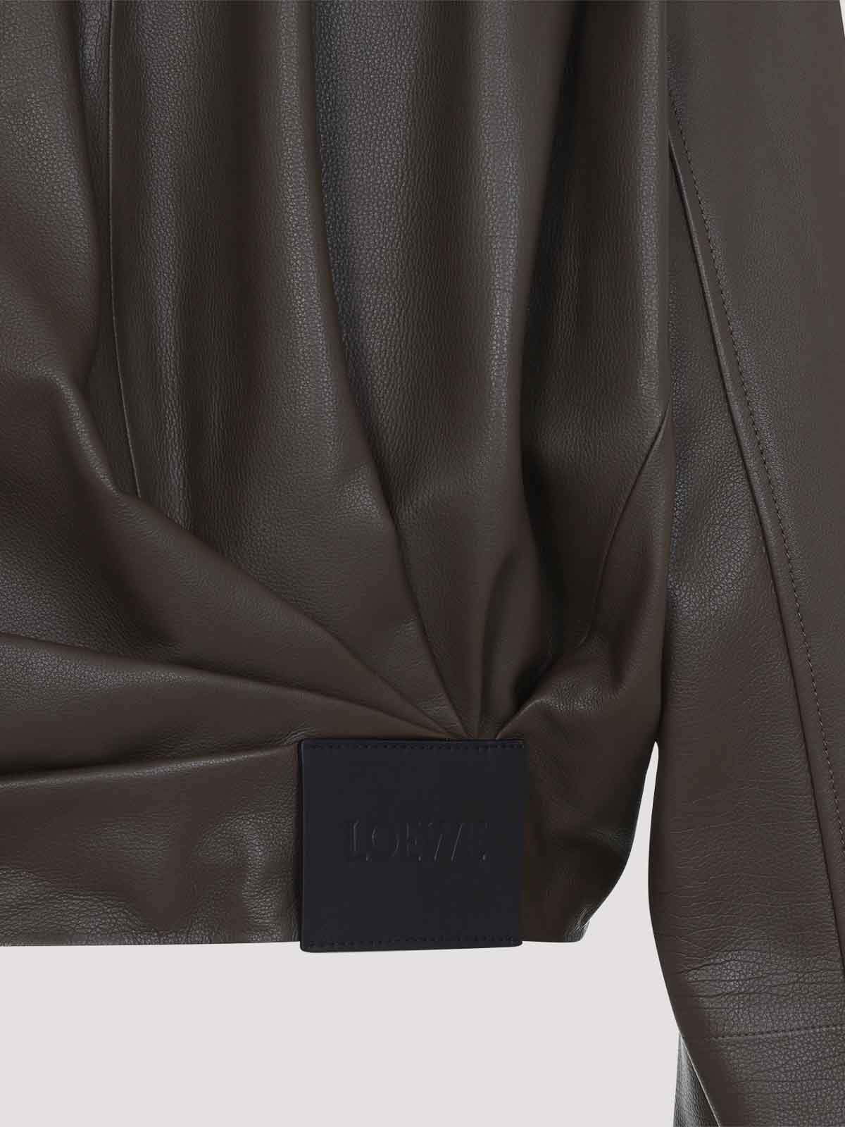 Loewe dark green calf skin draped jacket. pure dark green calf skin jacket, pointed collar, front zipped fastening, side pockets, dropped shoulders, long sleeves, draped effect on the front and on the back, straight hem.