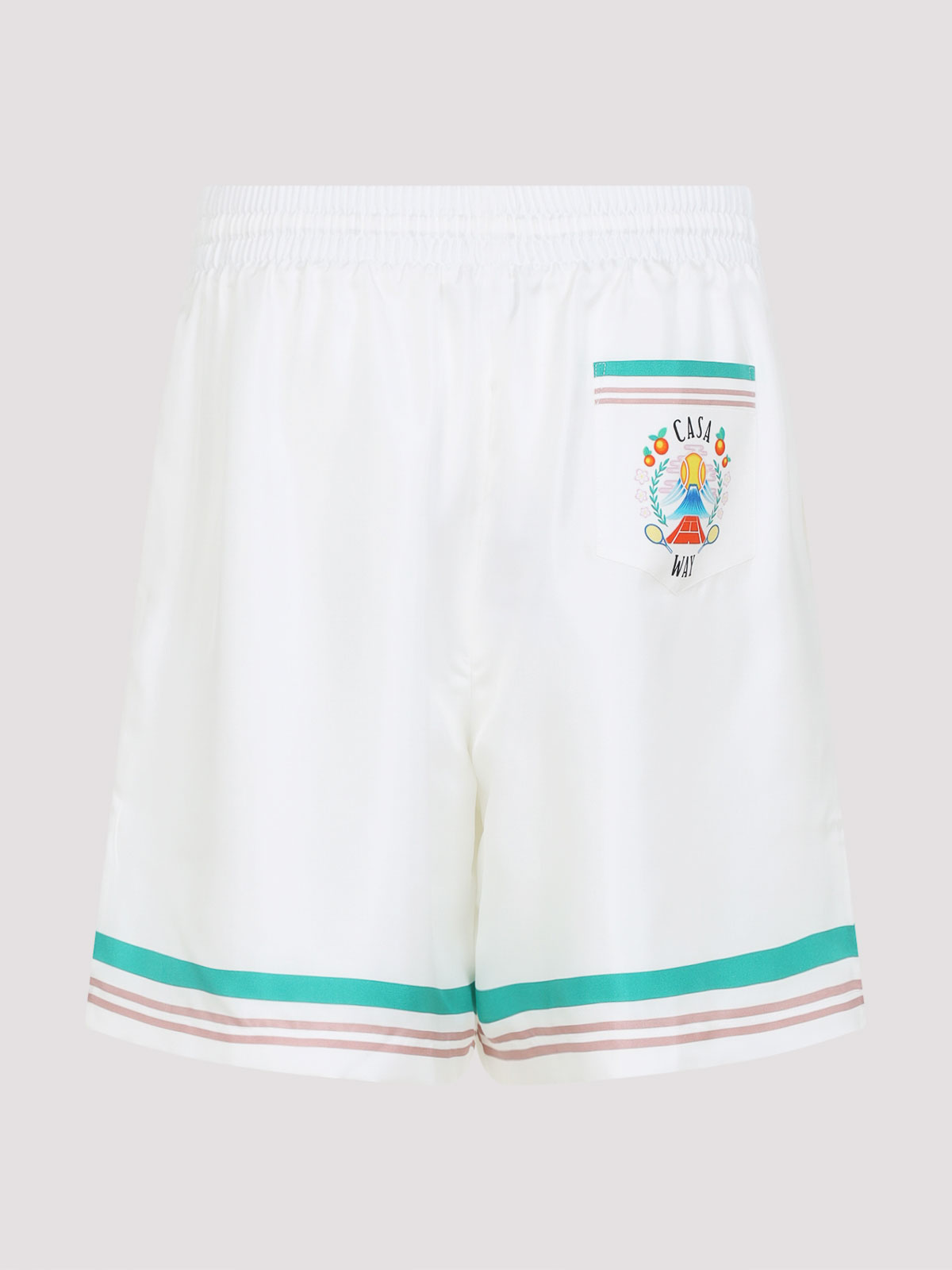 Casablanca drawstring white silk shorts. white silk twill, elastic waistband with drawstring, red and pink stripes at the edges, inseam side pockets, one back pocket with casa way graphic print, relaxed fit.