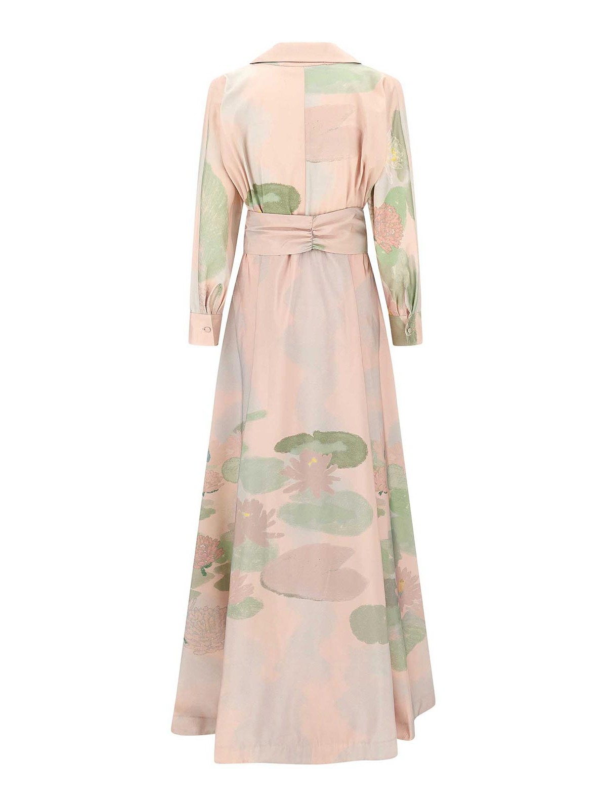 Long 'beatrice' dress with cotton chemisier style top, front button closure, long cuffed sleeves, side zip closure, wide and airy taffeta skirt with front split, pockets, removable belt.