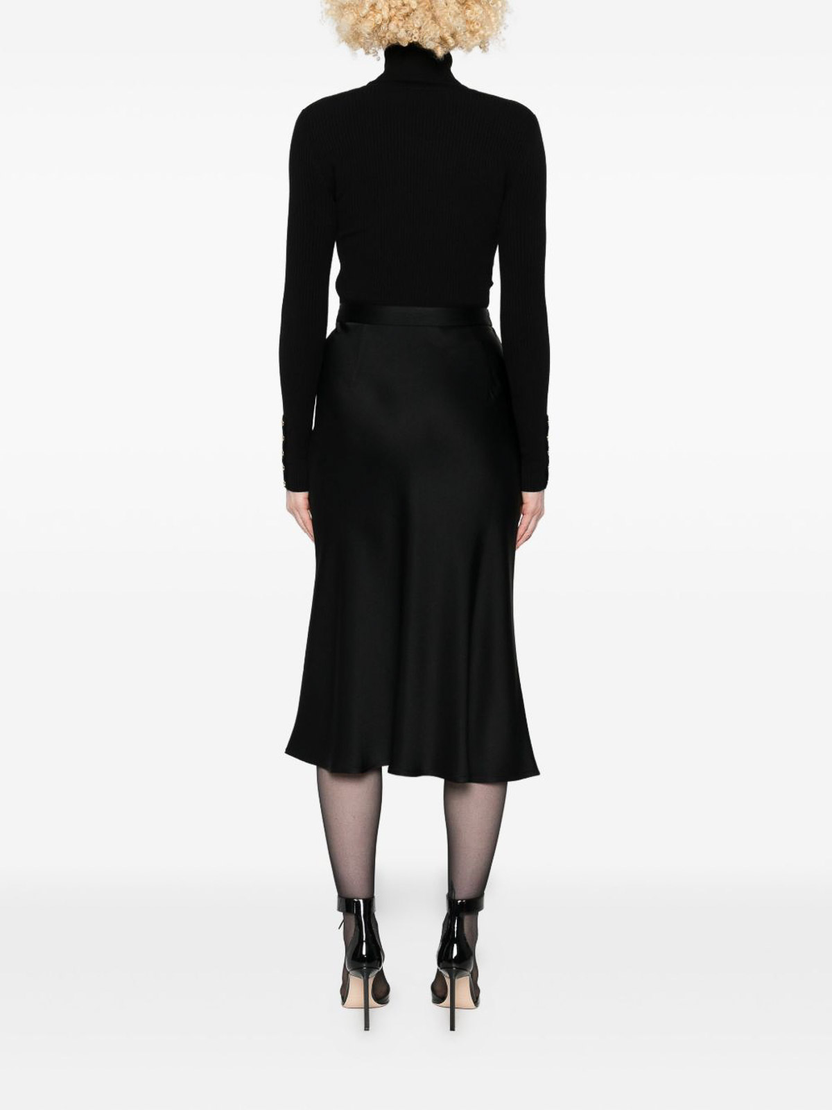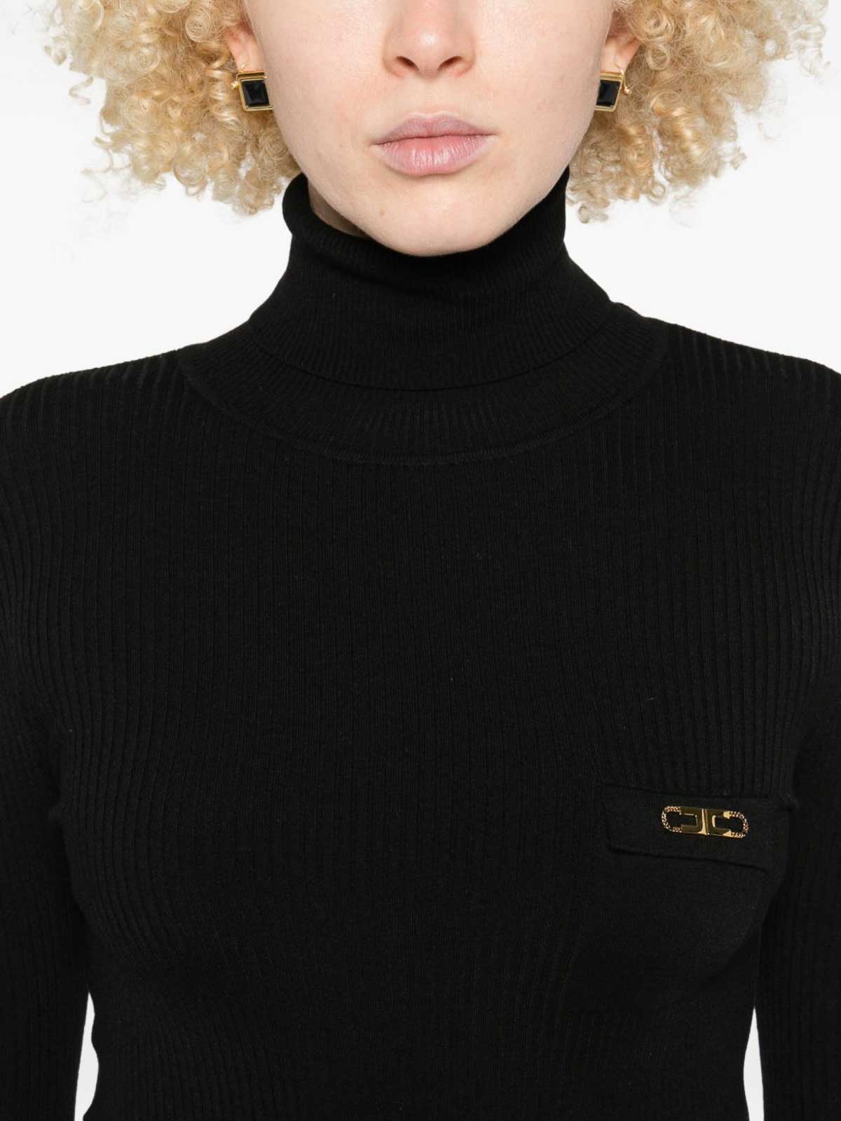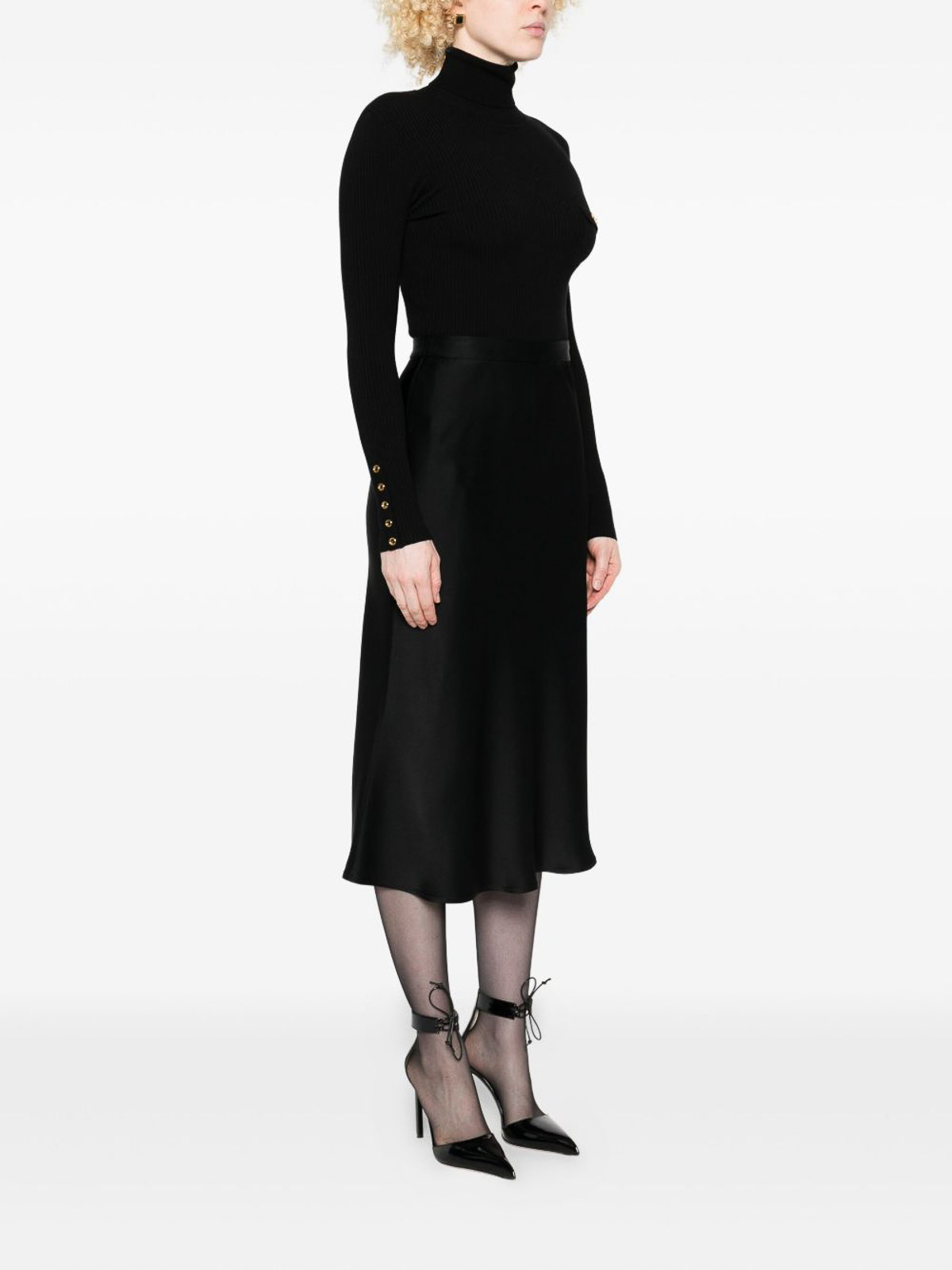 Black ribbed knit bodice, tone buttoned cuffs high neck a, line skirt logo plaque