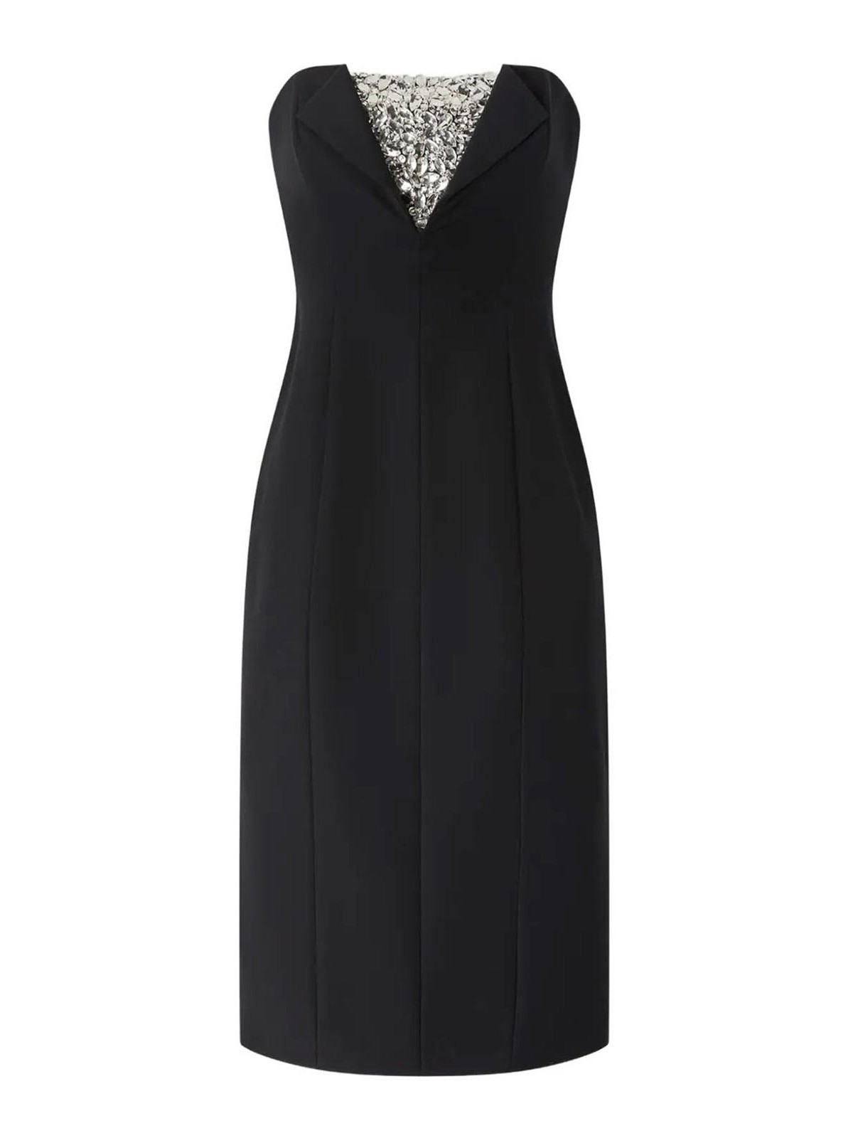 Strapless sheath dress, featuring a bodice that opens to a beautiful sweetheart neckline embellished with multi-colored rhinestone embroidery, a fitted silhouette that extends below the knee, and a hidden back zip closure. composition: 49% viscose, 42% polyamide, 9% elastane made in italy