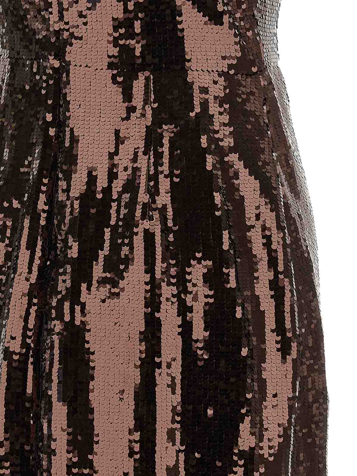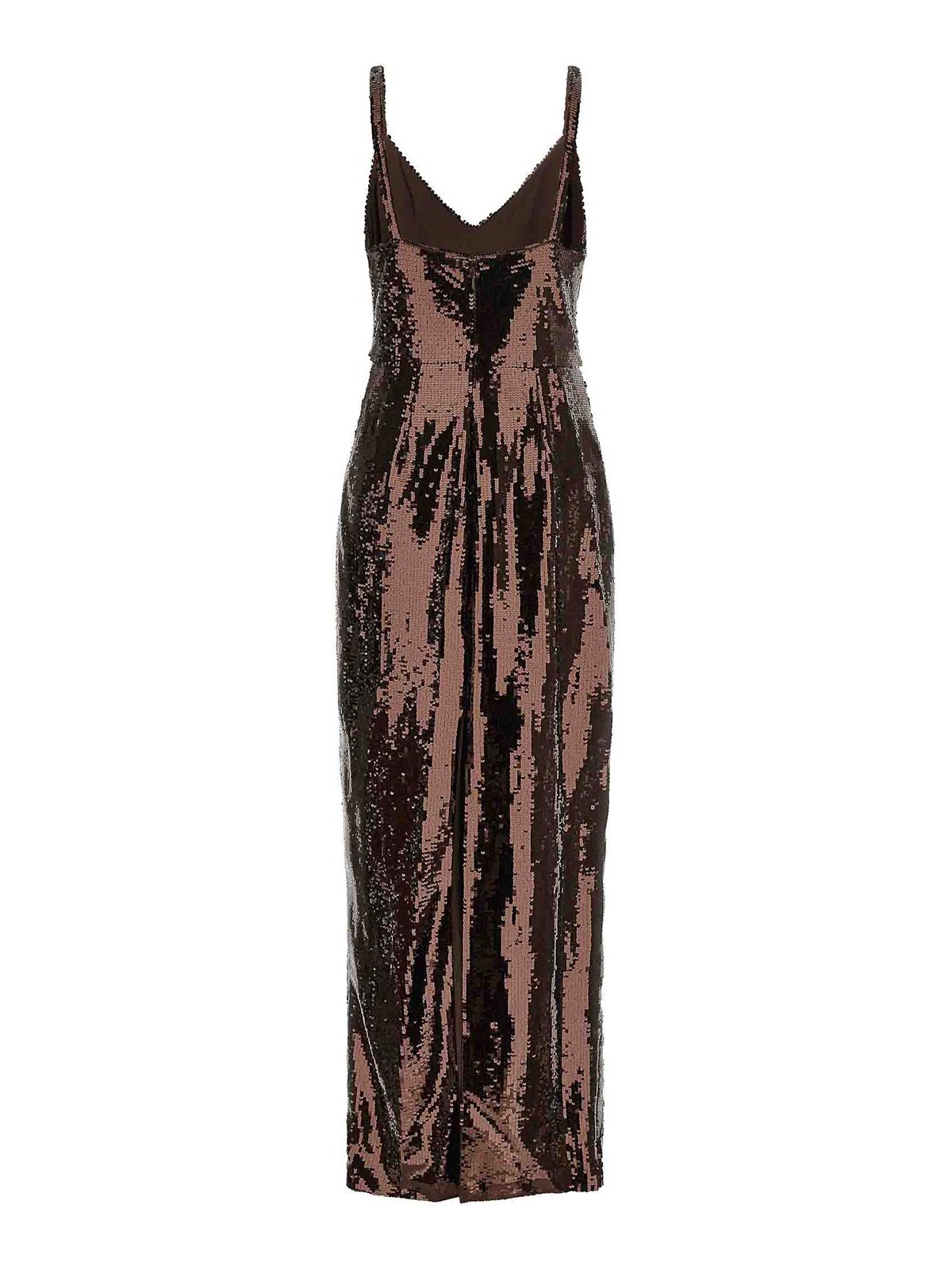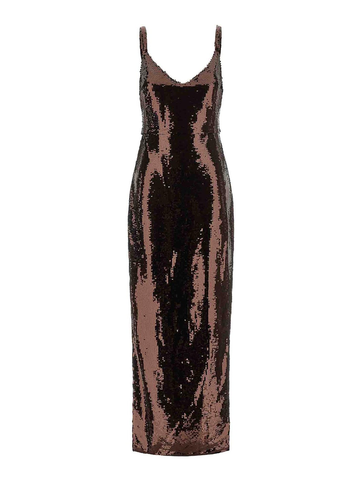 Long 'karma' fabric dress with all-over sequin appliqu, hourglass silhouette with marked waist, v-neck, thin straps, sleeveless, zip closure and back split, lining.