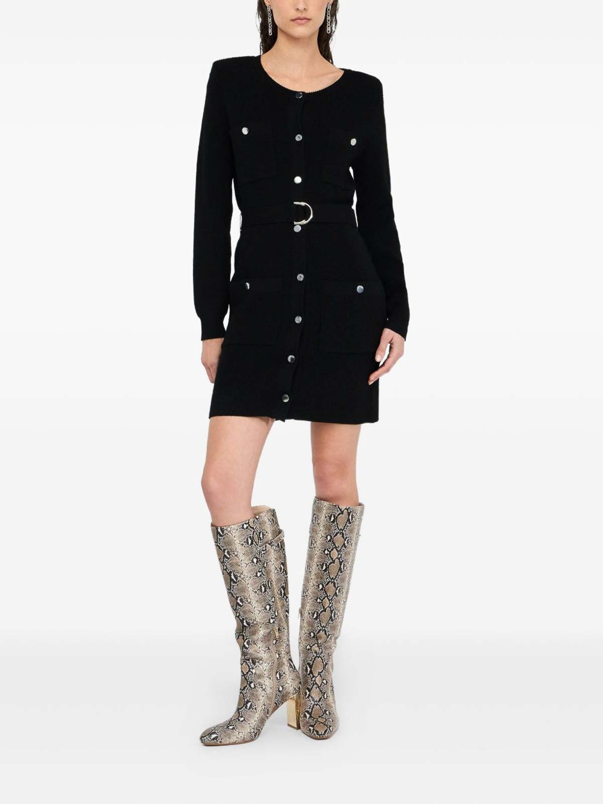 Black padded shoulders button welt pockets ribbed knit adjustable belt