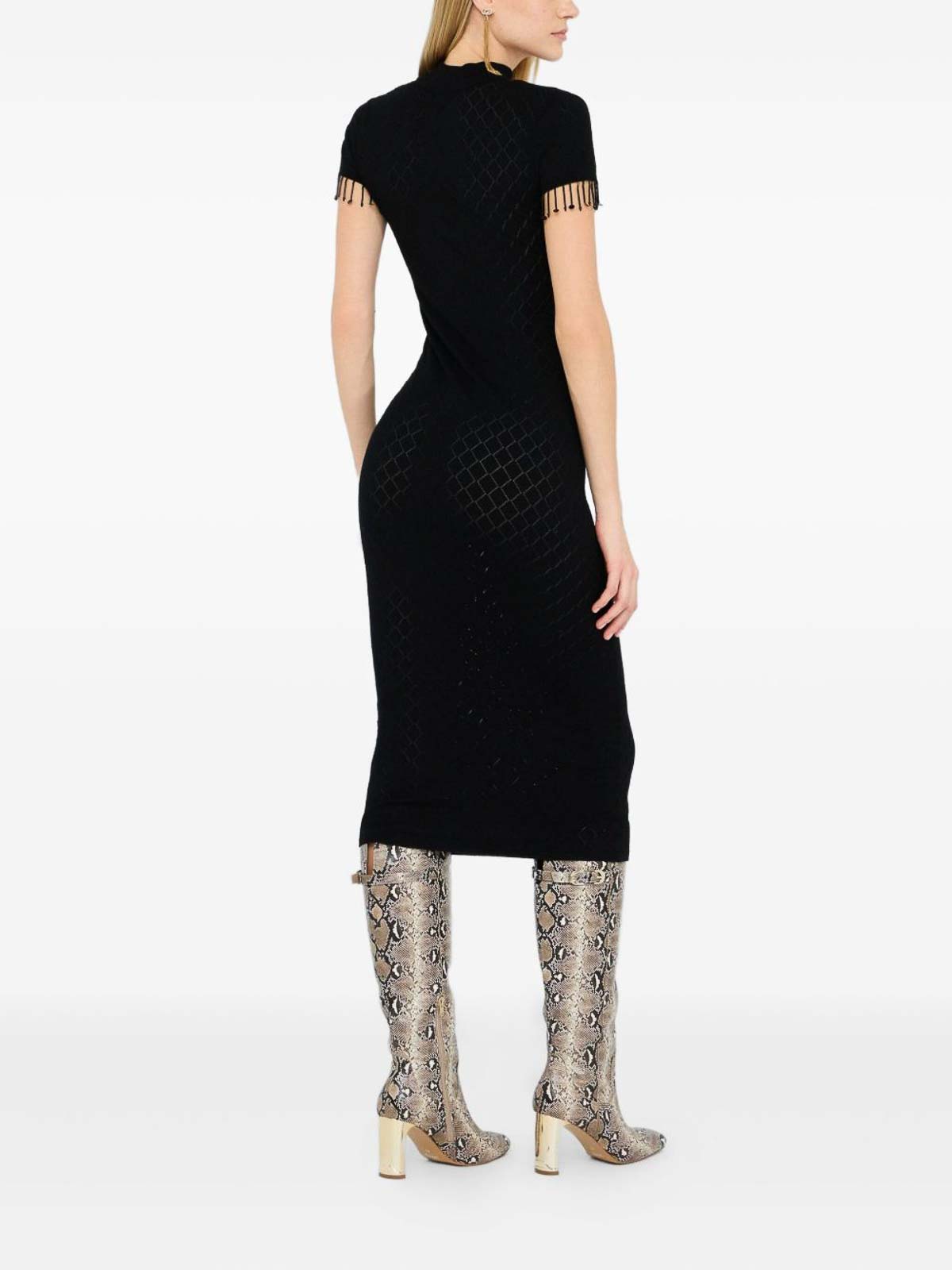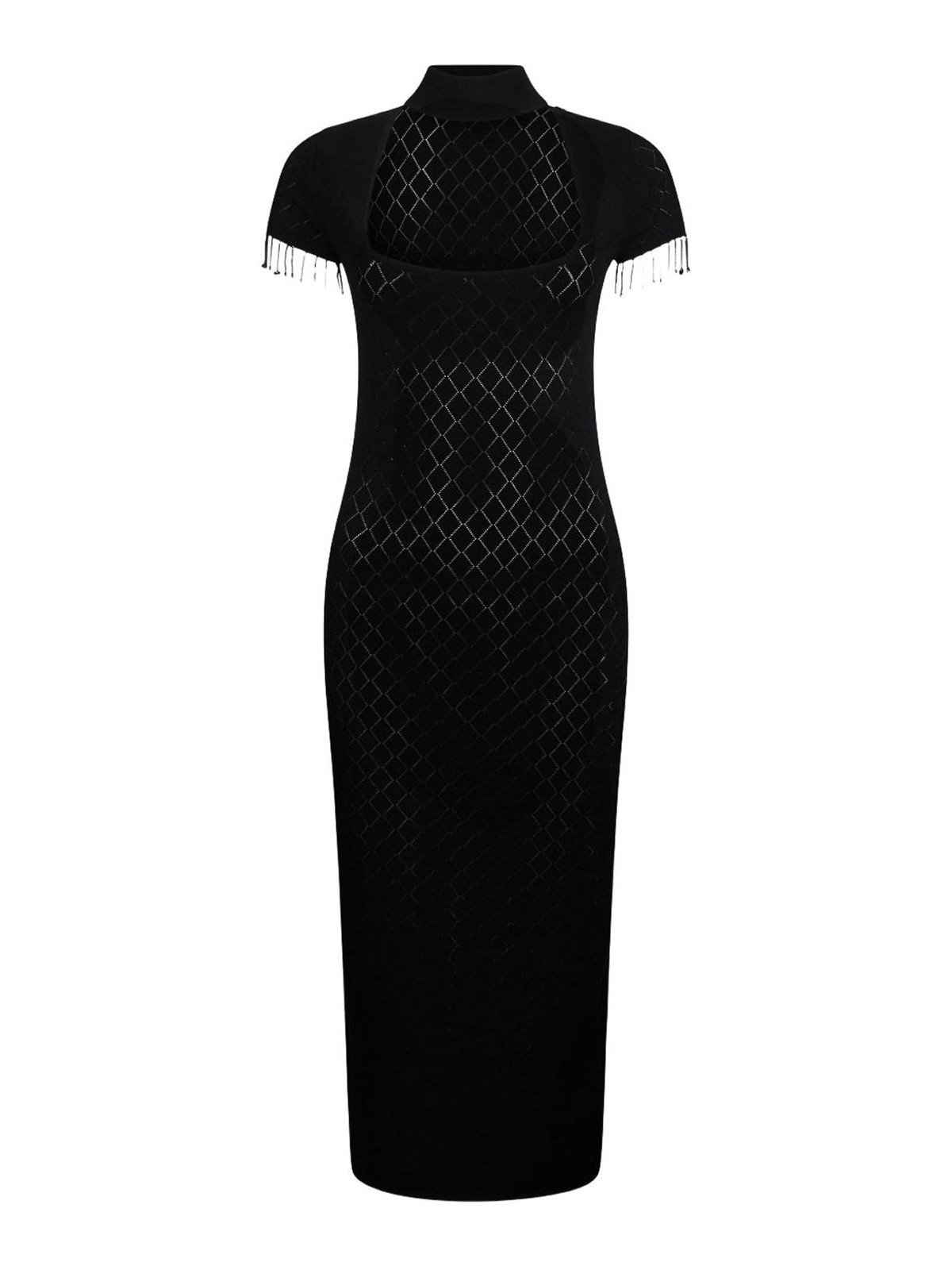 Black pattern scoop neck cut, out short sleeves fringe detailing