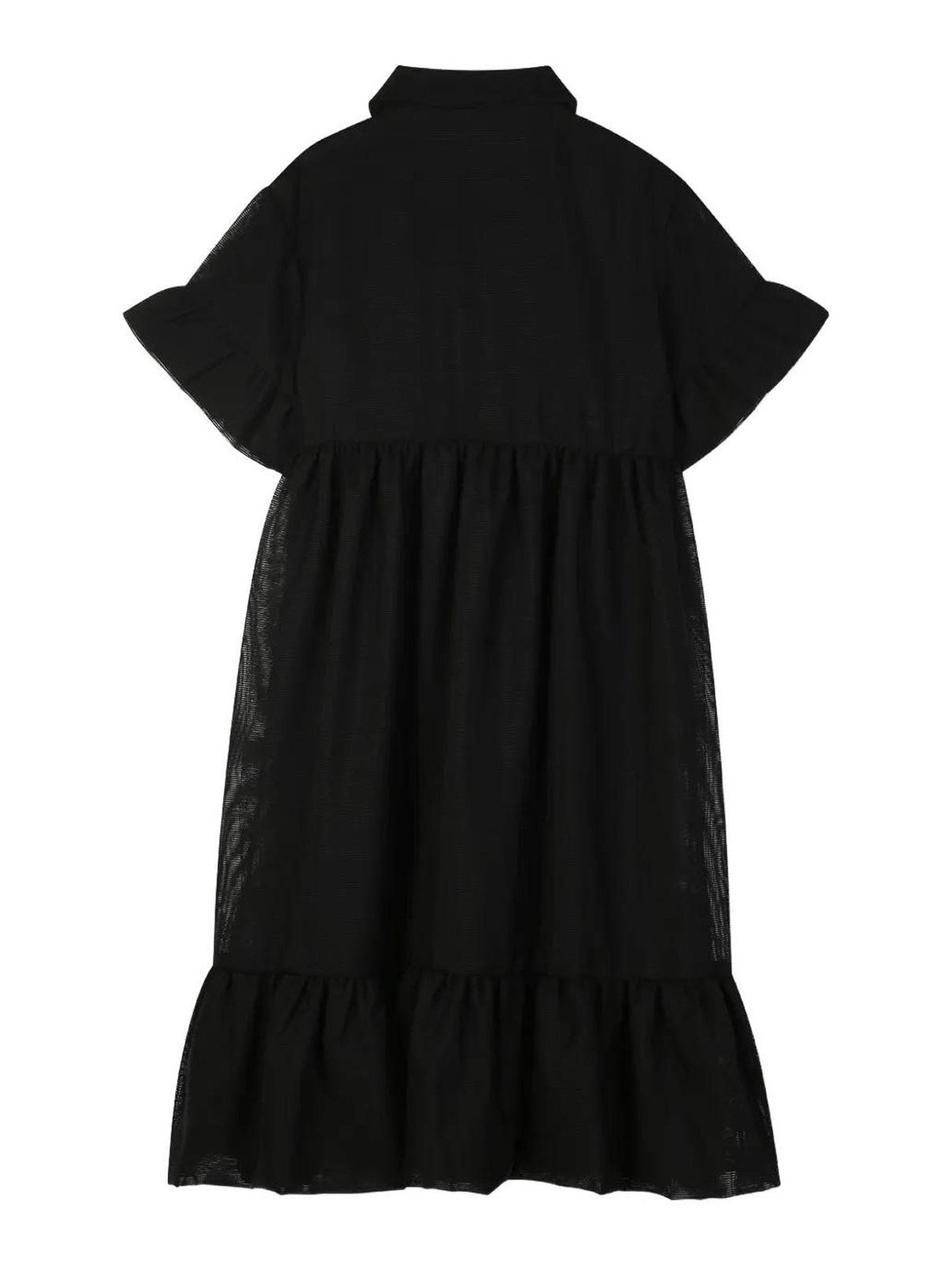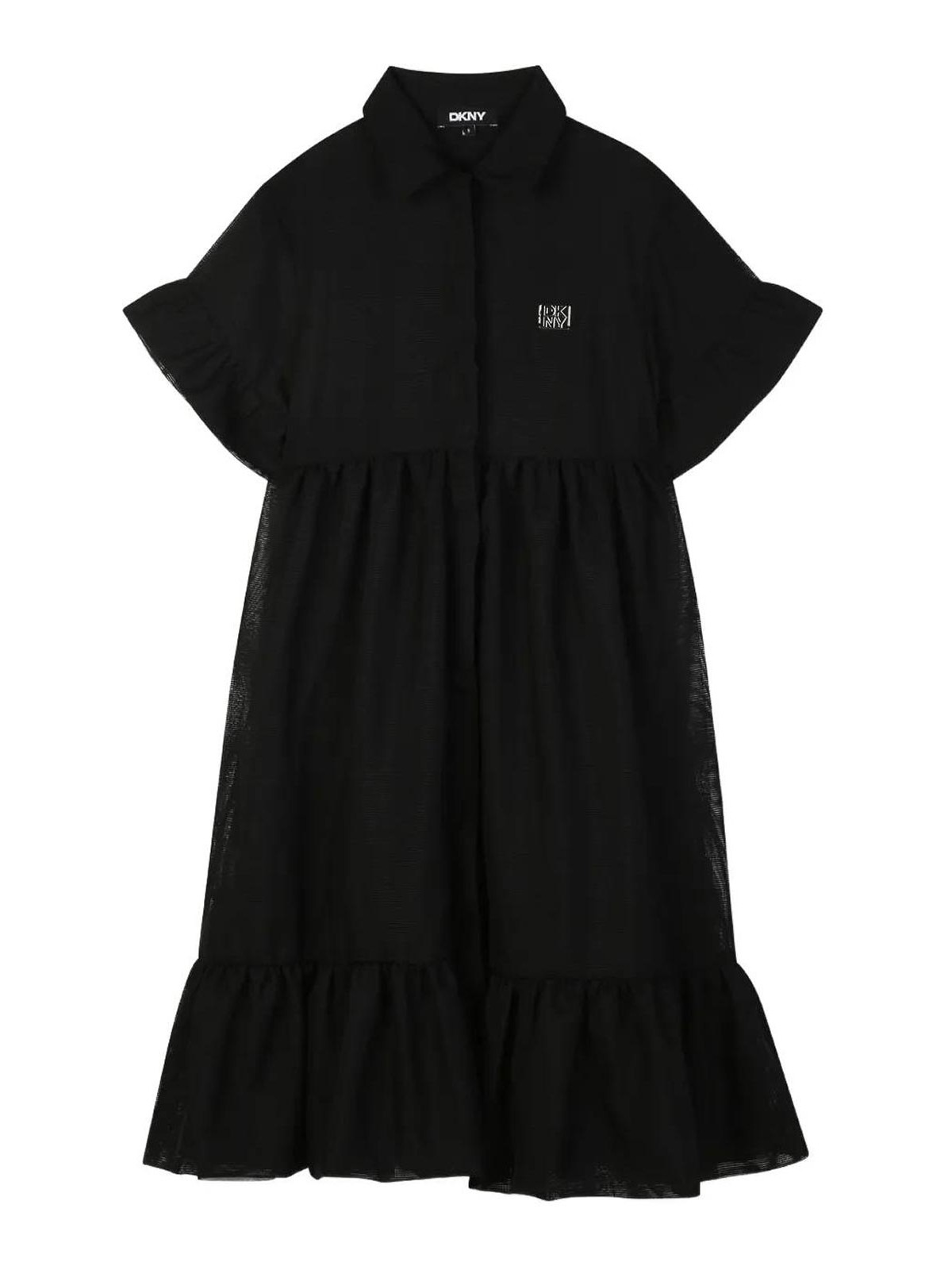 Dress with black logo, front buttoning, short sleeves with logo, ruffled hem