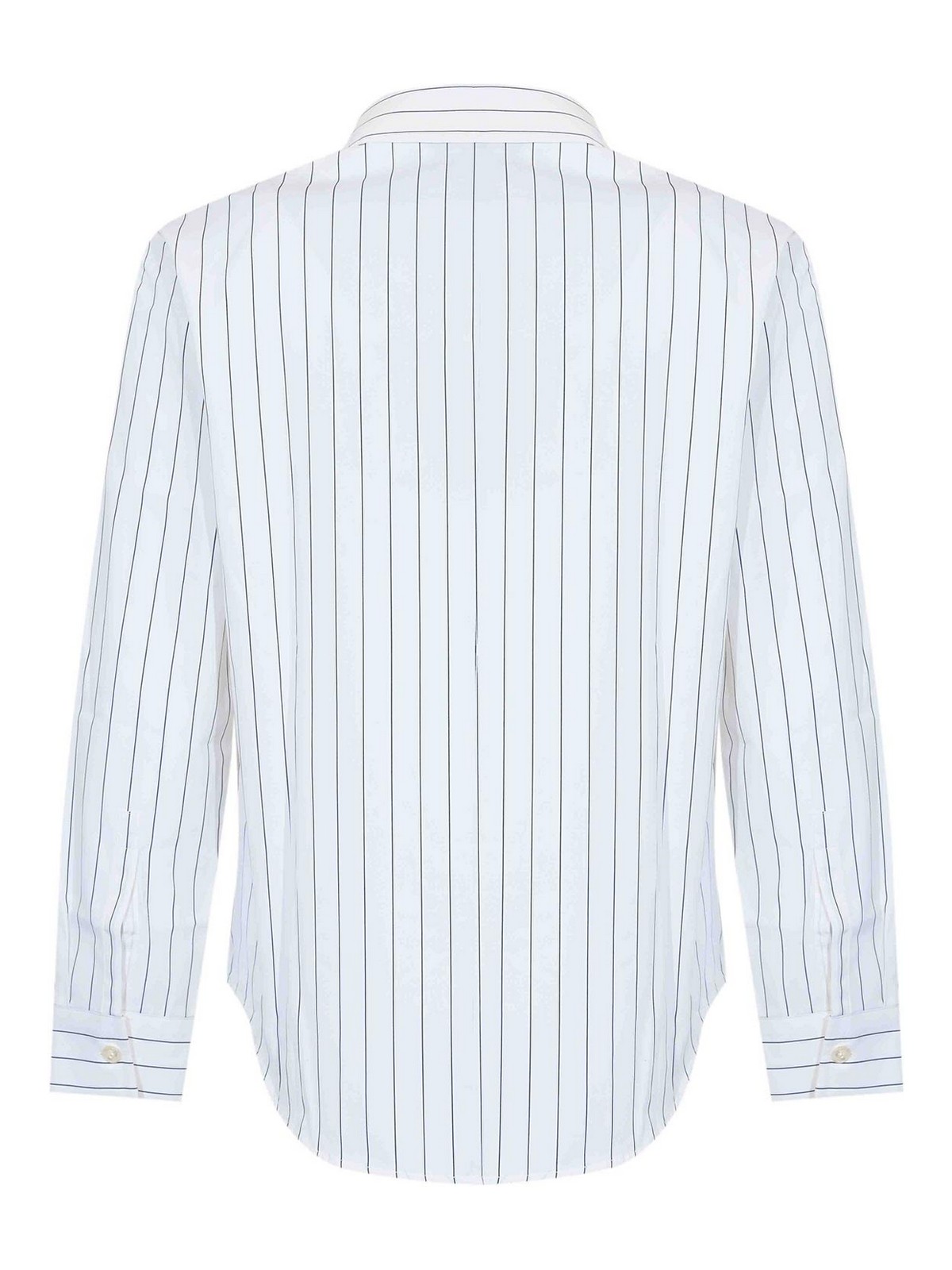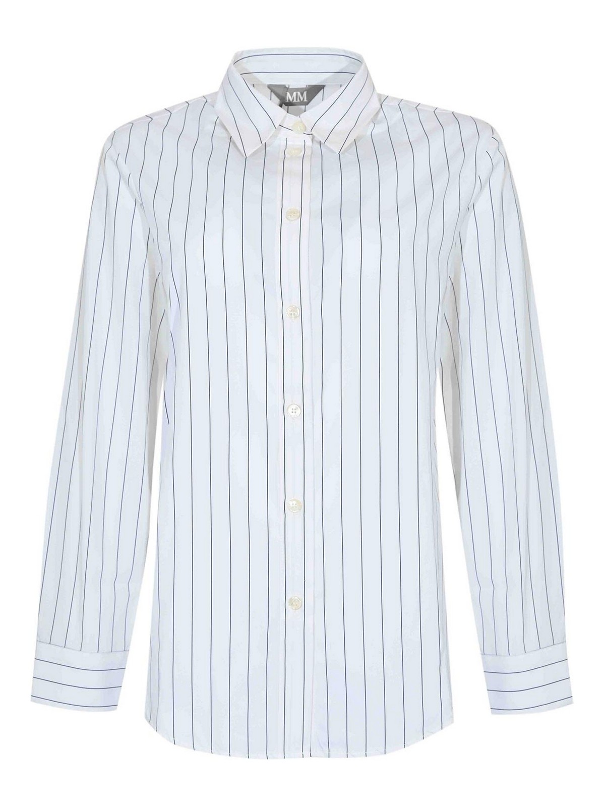 Striped cotton shirt max mara, effige model fabric: cotton pattern: thin vertical blue stripes on a white background sleeves: long with cuffs and buttons collar: classic shirt closure: front with tone-on-tone mother-of-pearl buttons pockets: none details: clean line with a straight fit, rounded hem, tone-on-tone stitching lined: no fit: regular