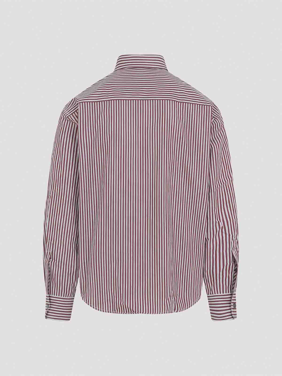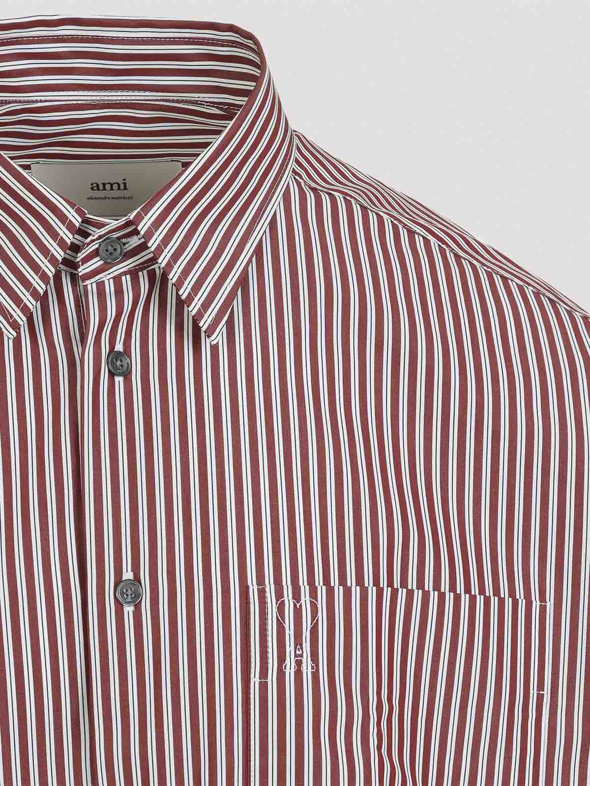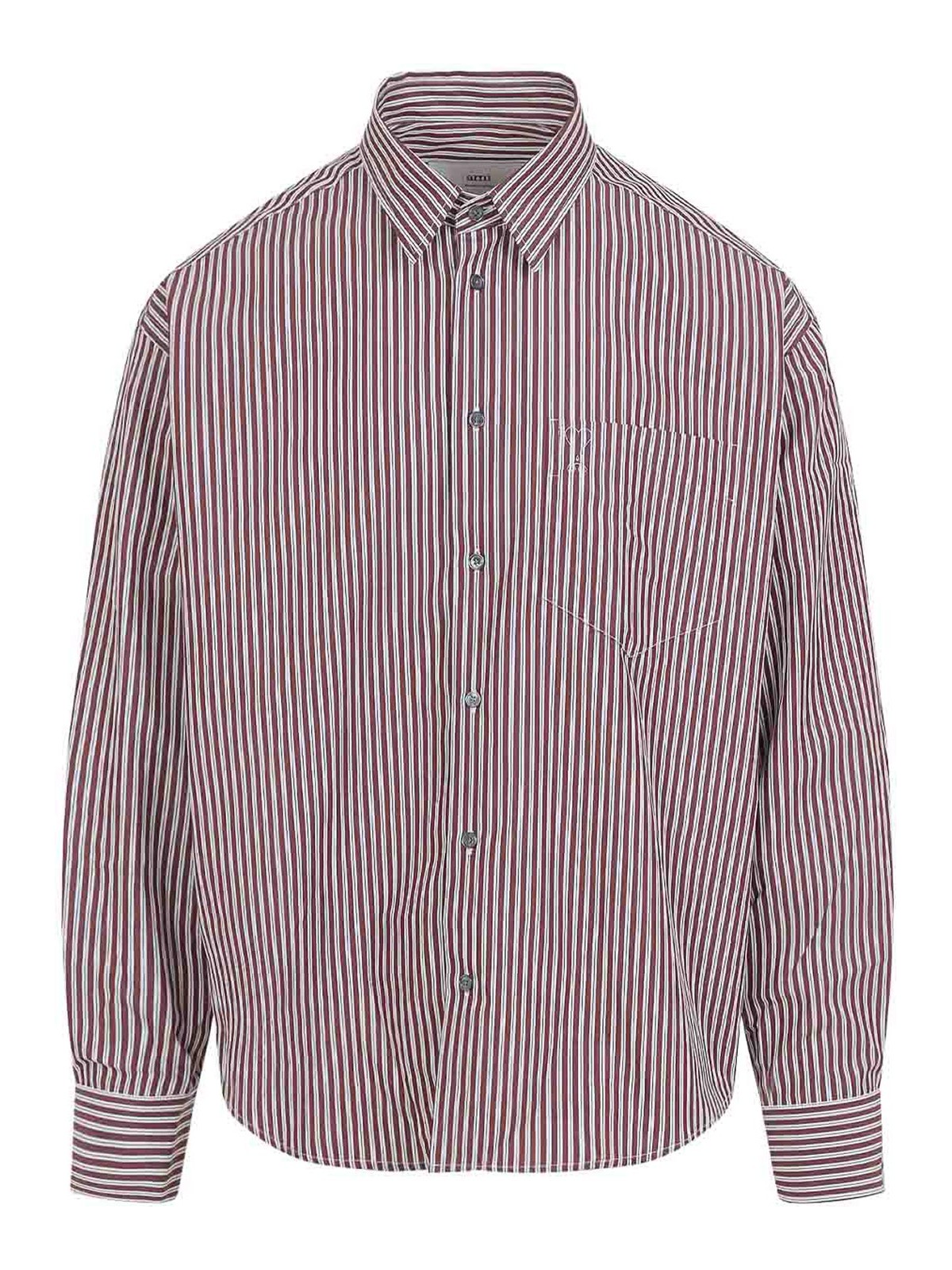 Ami cherry red embossed adc boxy shirt pure shirt pointed collar buttoned chest patch pocket with white embroidered logo long sleeves buttoned cuffs round hem cherry red white and black stripe pattern all, over