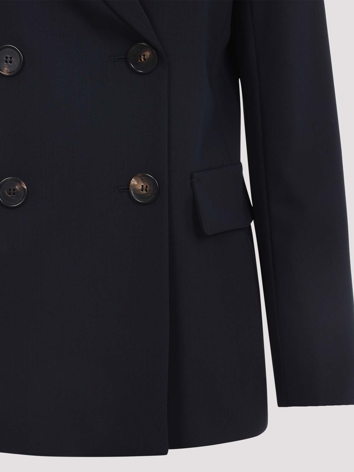 Max mara`s blue virgin wool ester double-breasted jacket. pure blue virgin wool jacket, notched collar, front buttoned fastening, double breast design, side flap pockets, long sleeves, buttoned cuffs, straight hem.