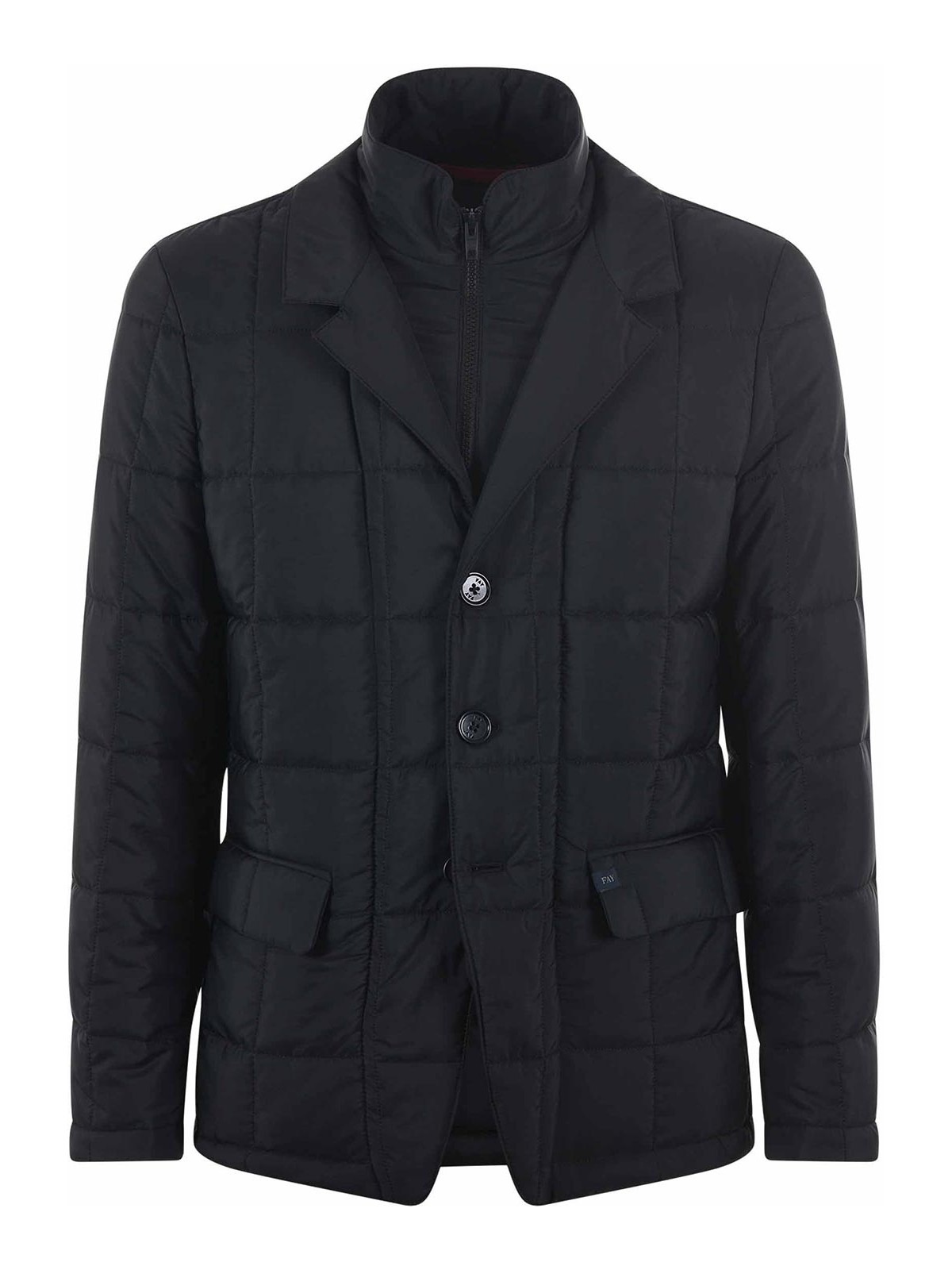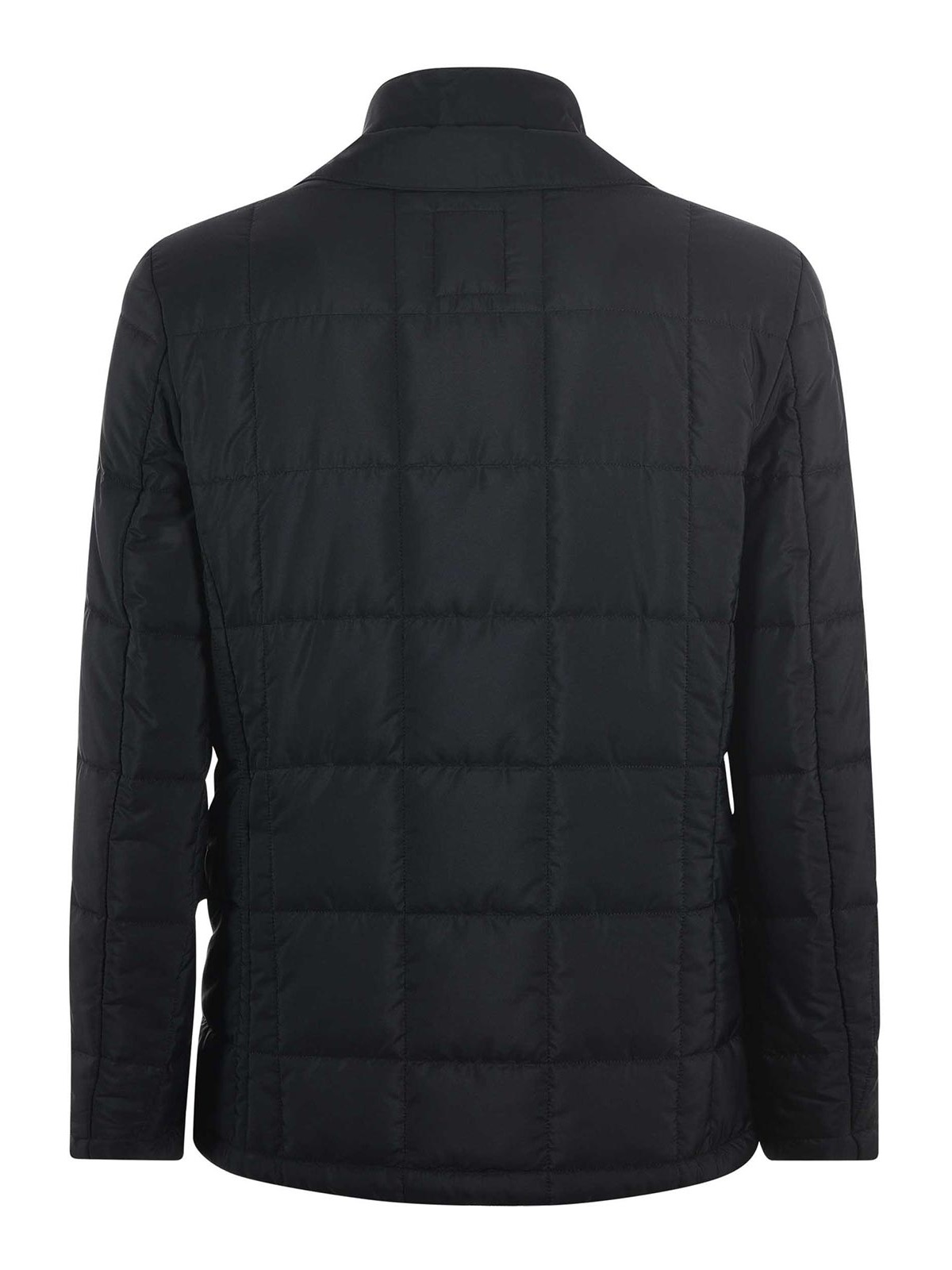 Fay jacket in black quilted quilted and padded double construction with high collar and zip button flap pockets chest pocket zip pocket logo patch measurement in photo m
