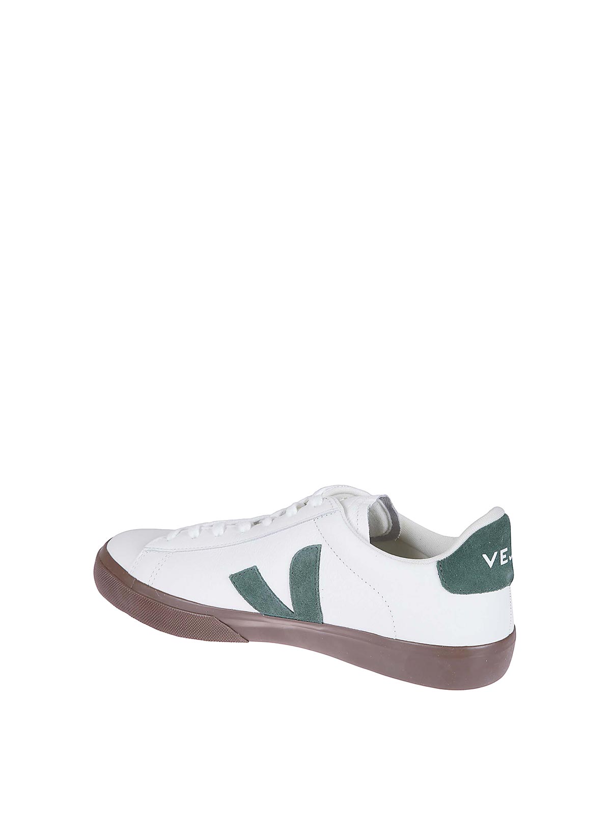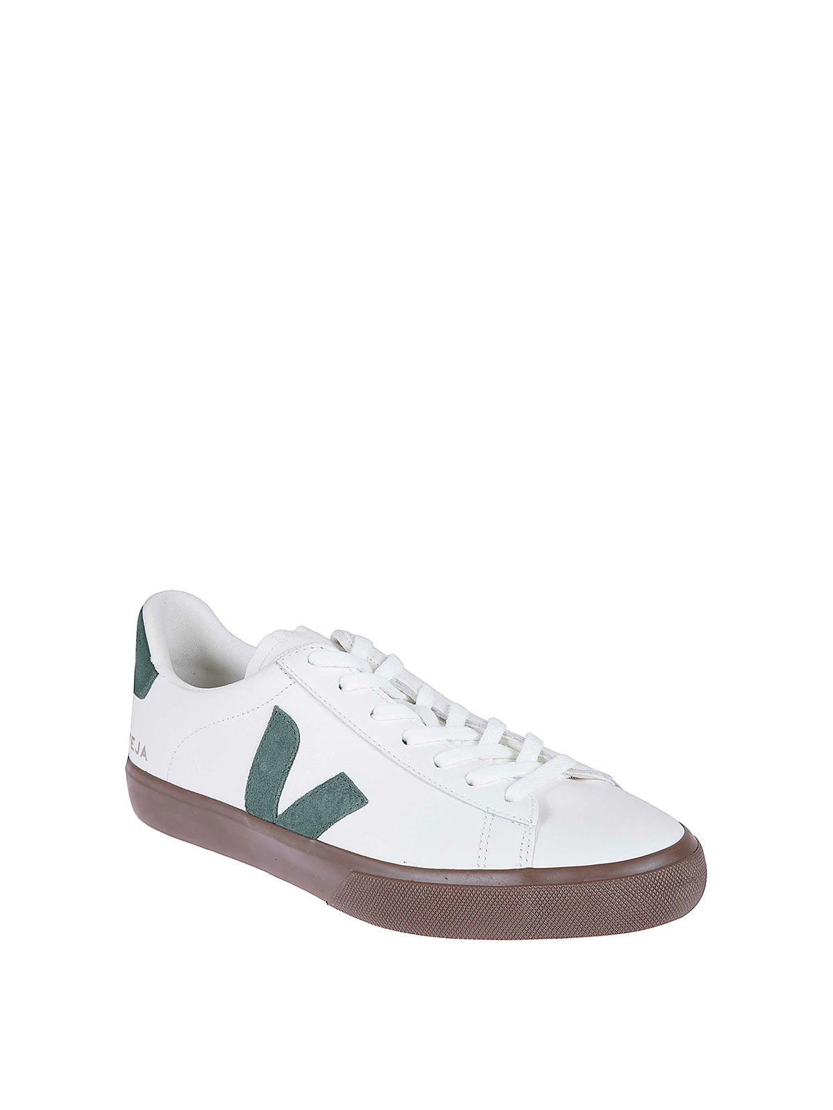 Campo chrome model, white leather upper, Veja logo, back detail and logo in green suede, brown rubber sole.