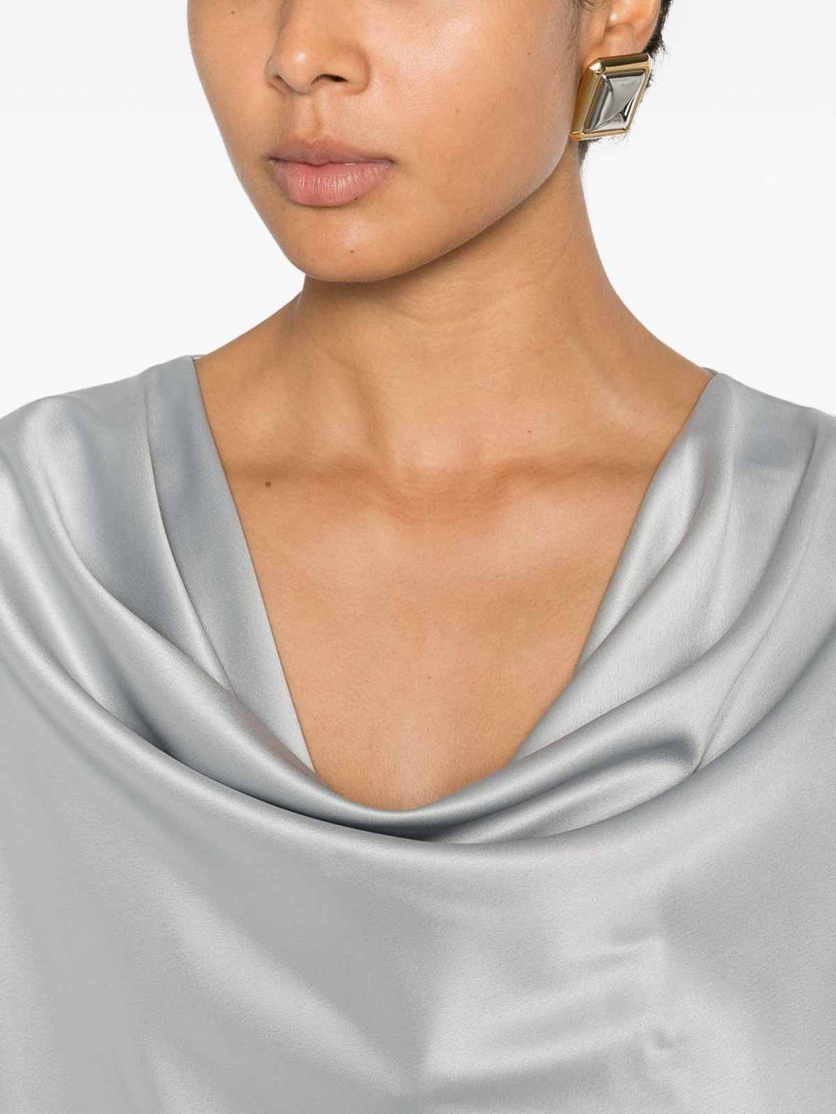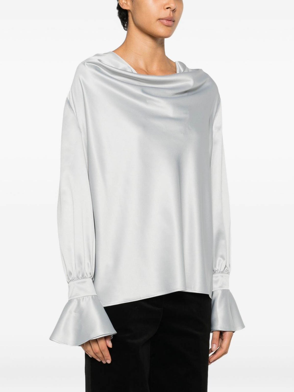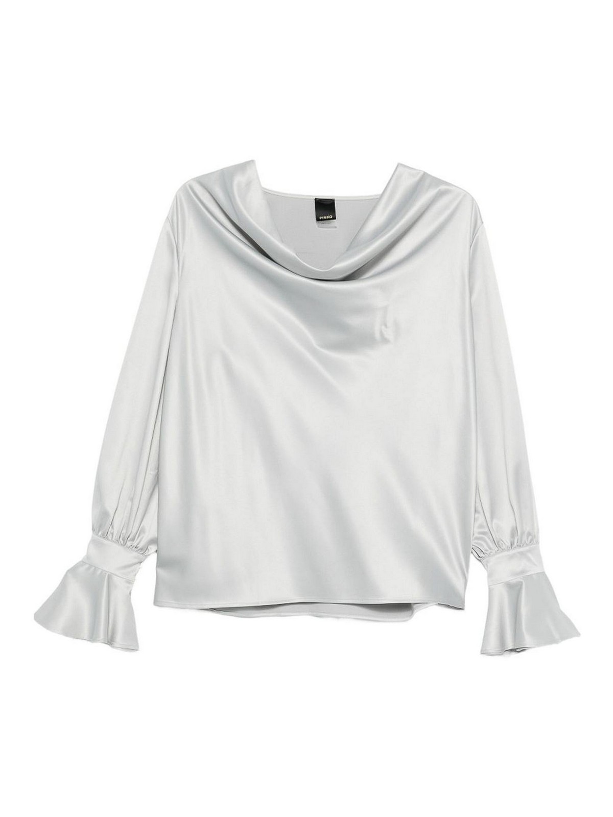 Silver, tone filipa blouse from pinko featuring a cowl neck long sleeves and ruffled cuffs a stylish and elegant piece perfect for adding a sophisticated touch to both day and evening looks