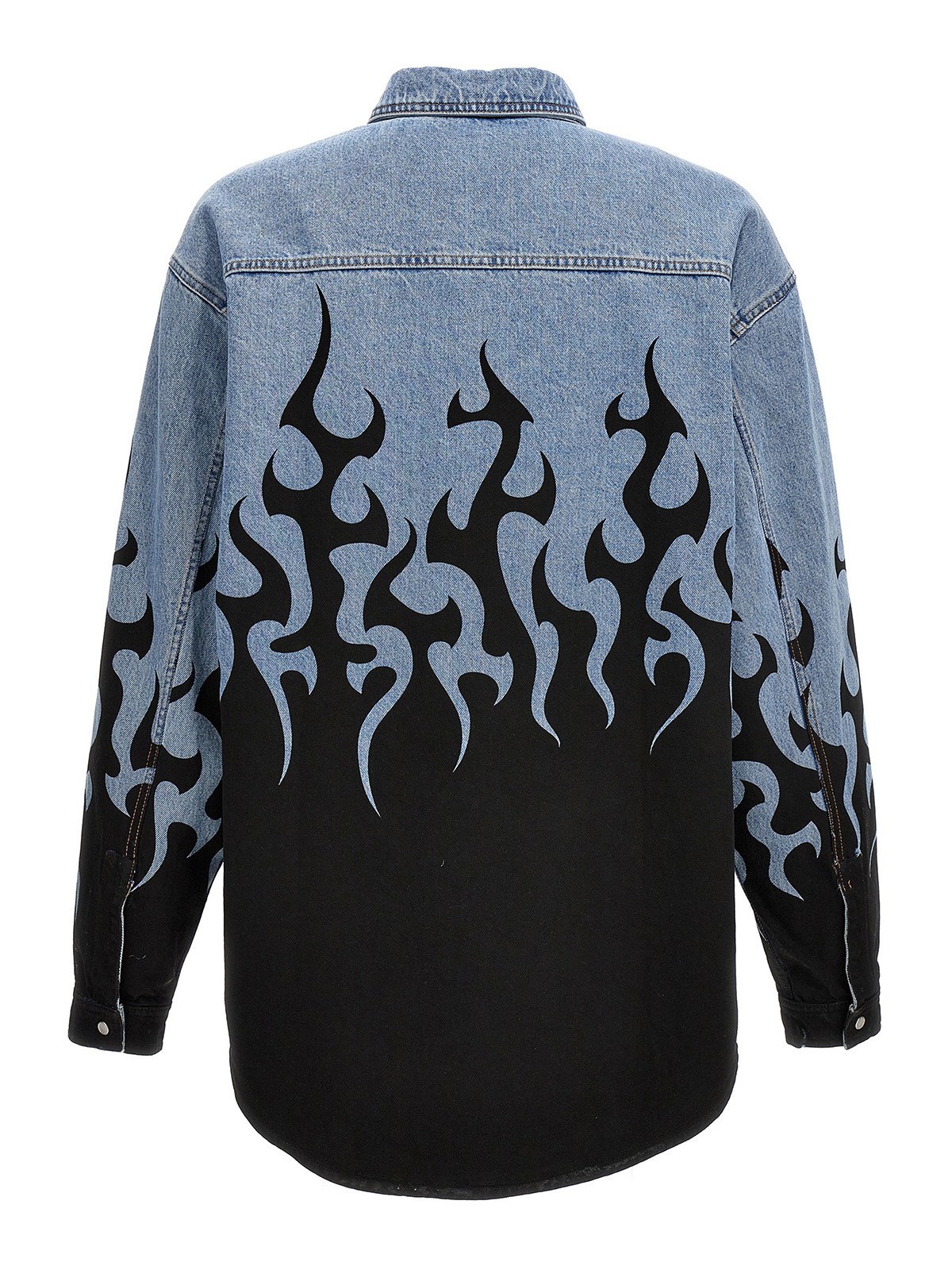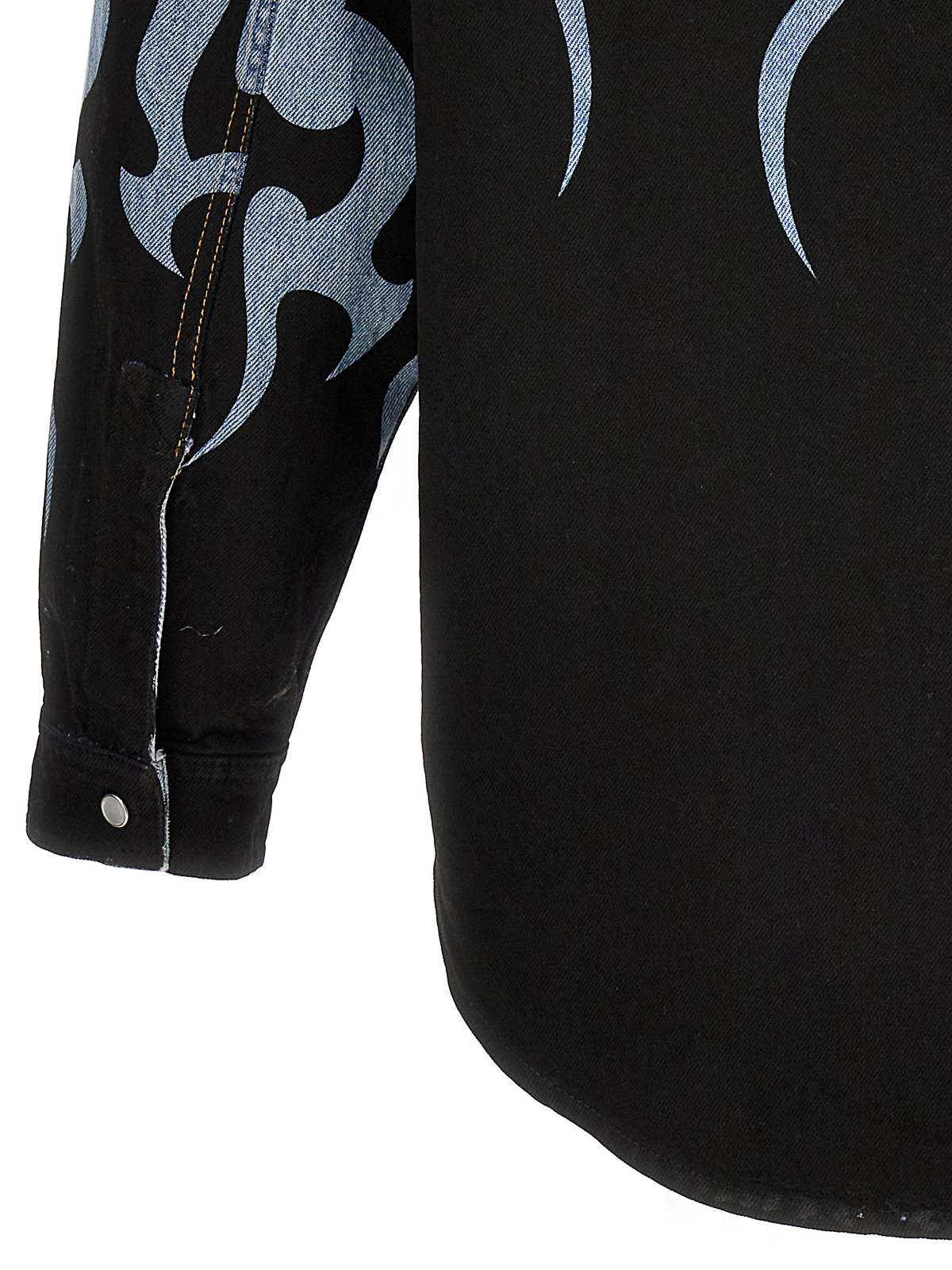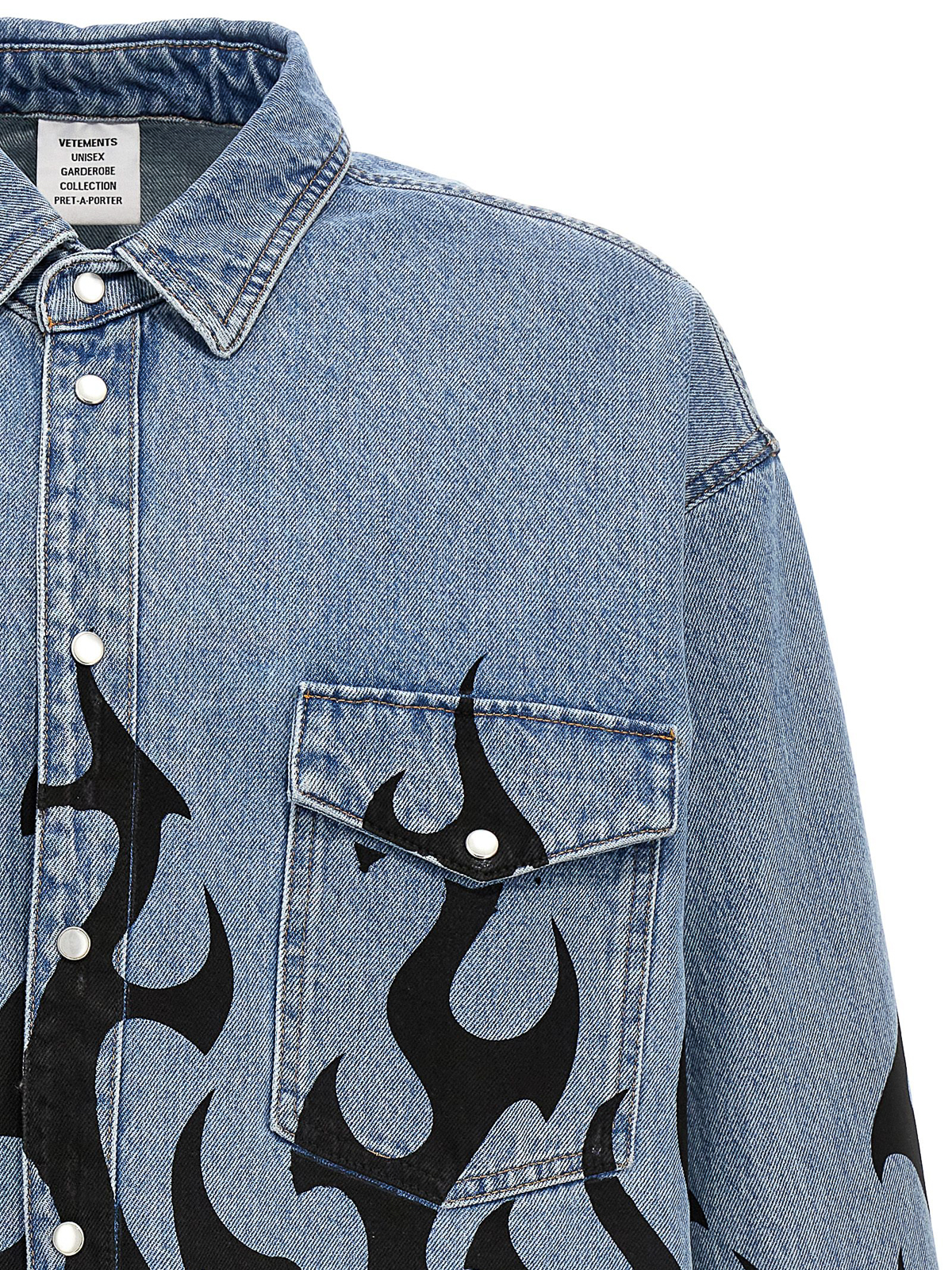Cotton denim shirt with contrasting flame print button closure front pockets and long cuffed sleeves